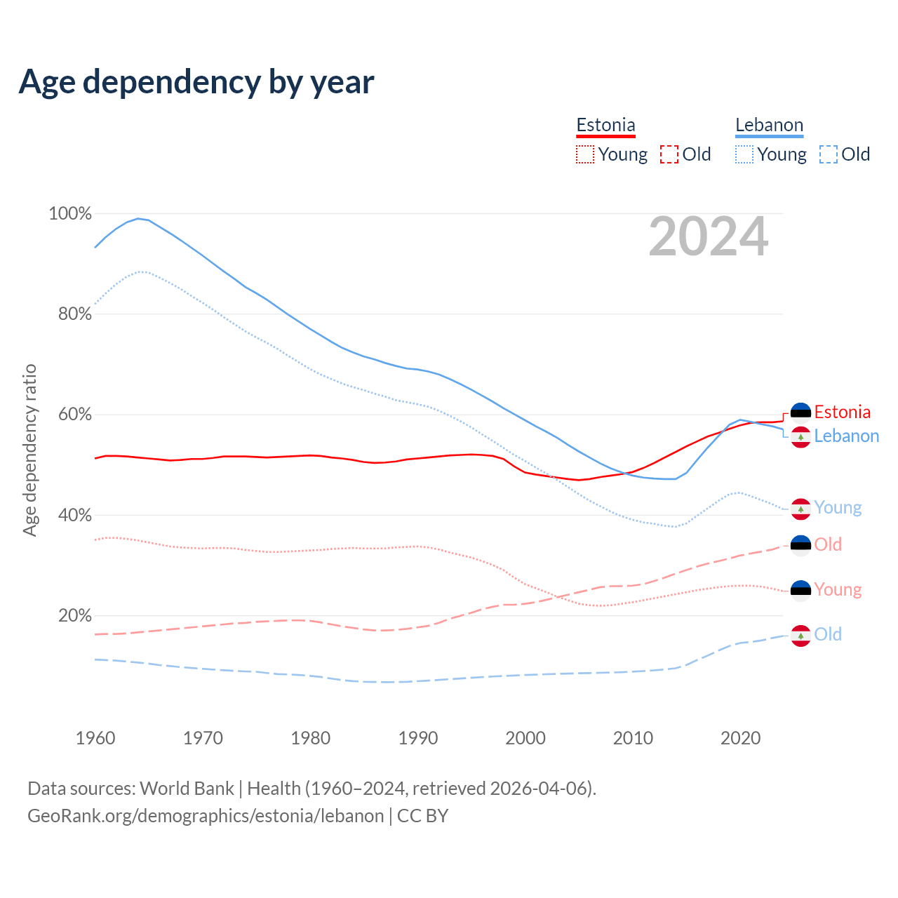 The share of older people aged 65 and over is 21.3% in Estonia and 10.1% in Lebanon. Life expectancy in Estonia compared to Lebanon .