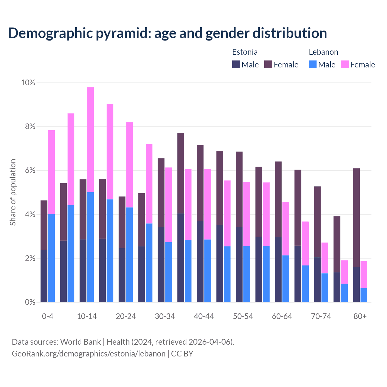 - As of 2026, the population of Estonia is 1.34M vs 5.91M in Lebanon - 4.41 times difference.