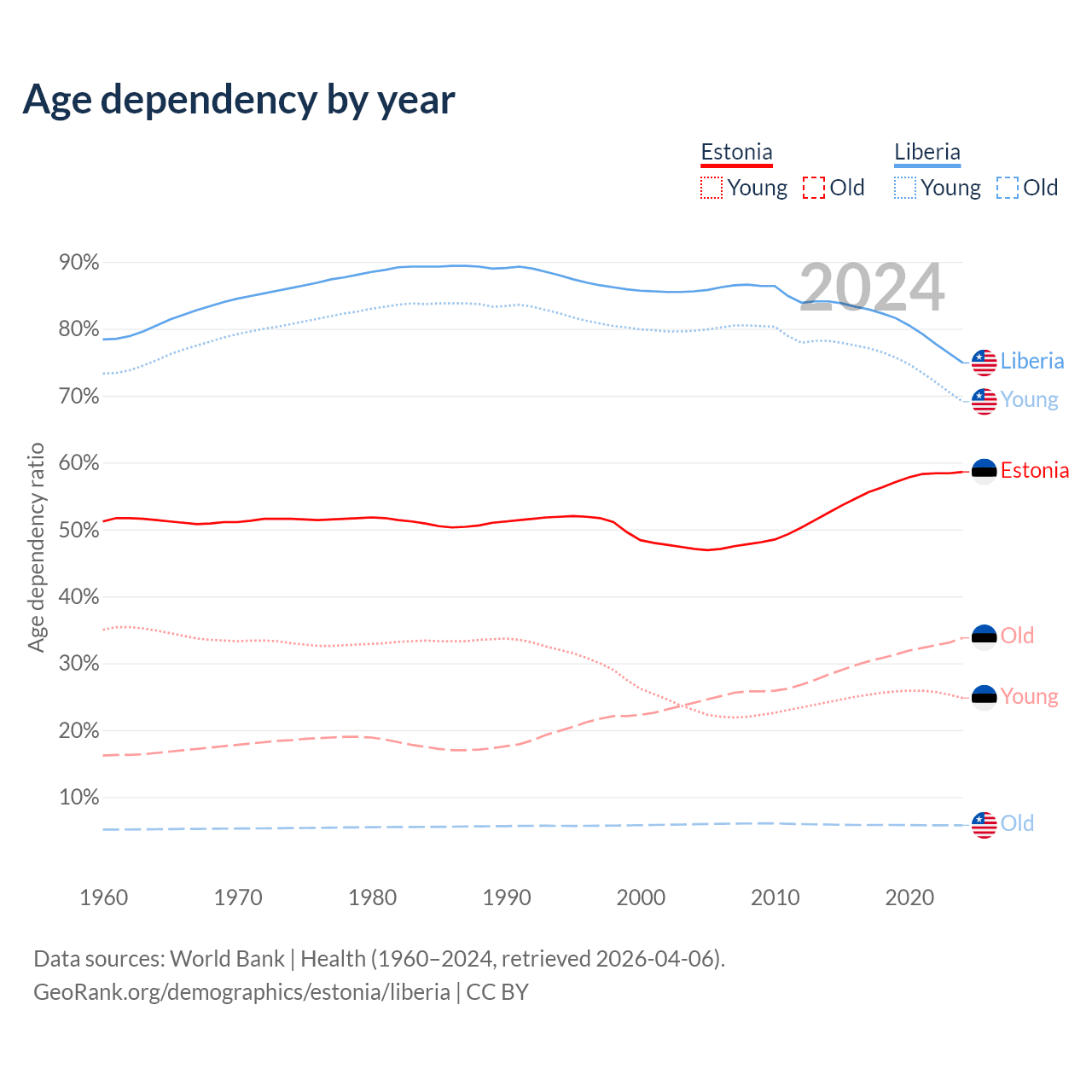 Data sources: World Bank | Health (1960–2024, retrieved 2026-04-06); U.S. Census Bureau (1960–2024, retrieved 2026-02-08).