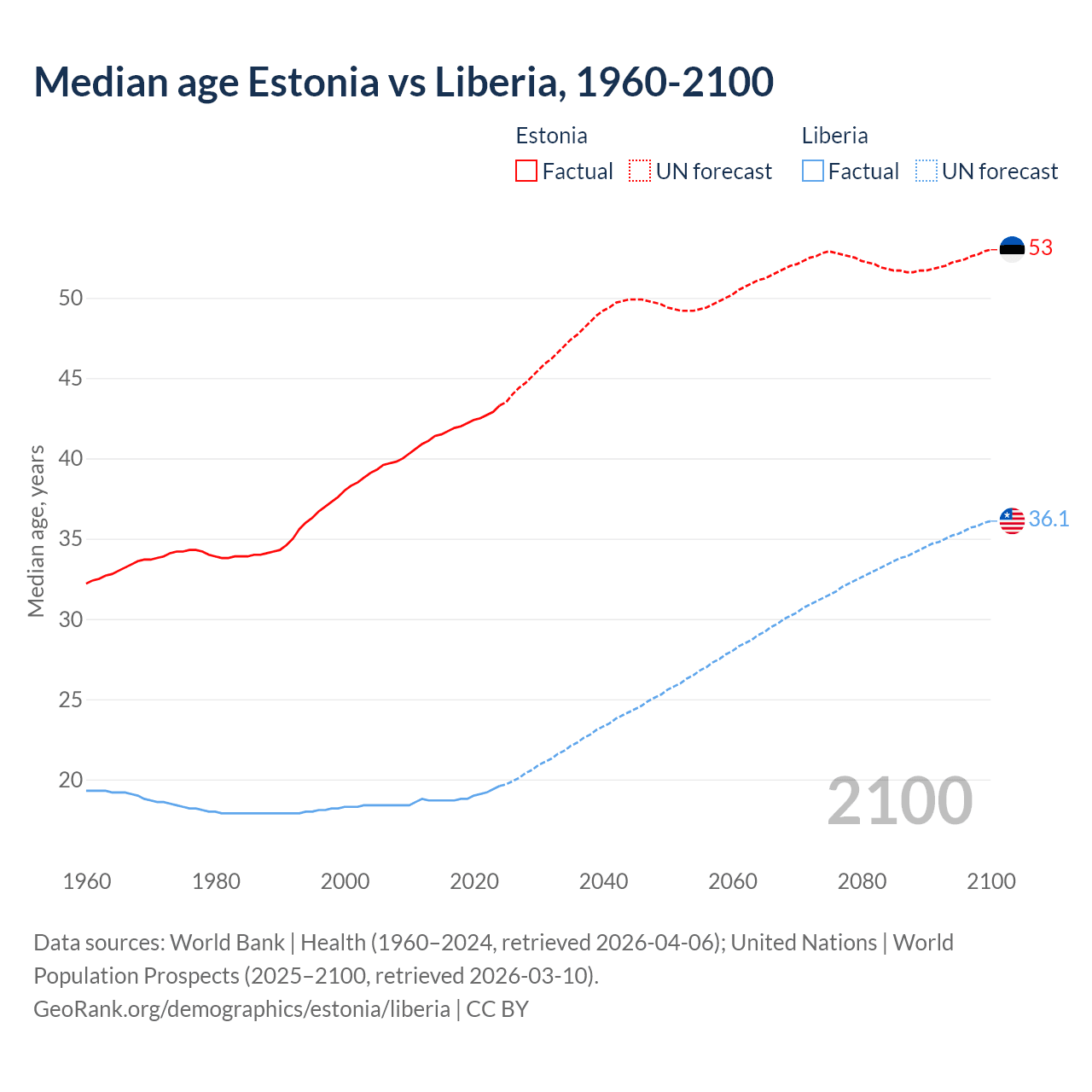 Median age Estonia vs Liberia, 1960-2100
