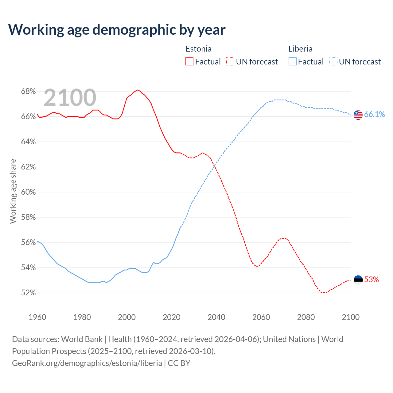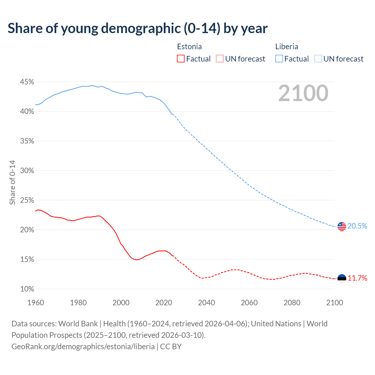 - The share of young demographic (0-15 years old) in Estonia is 15.6% vs 39.5% in Liberia.