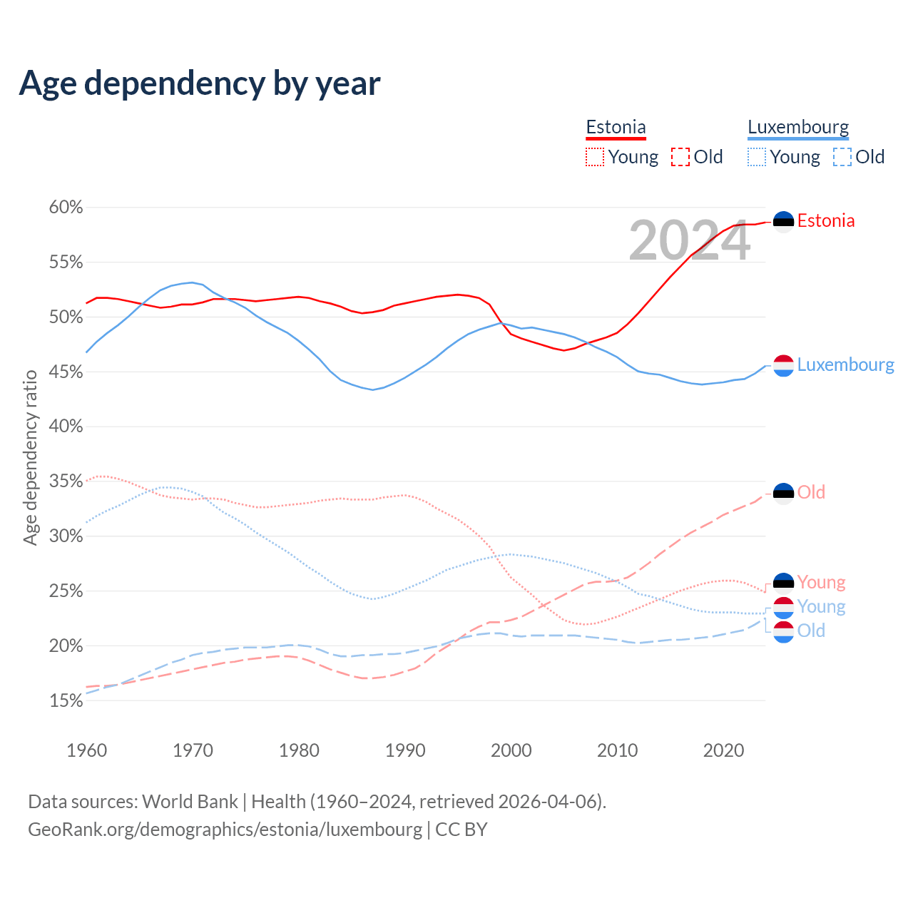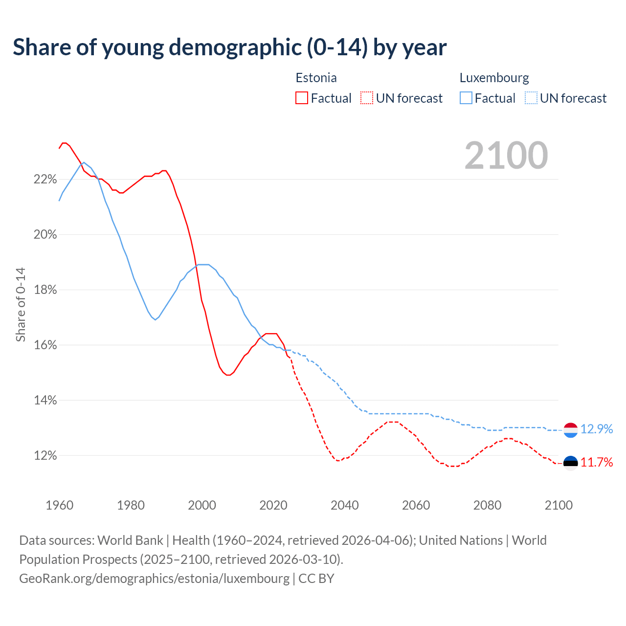 - The share of young demographic (0-15 years old) in Estonia is 15.6% vs 15.8% in Luxembourg.