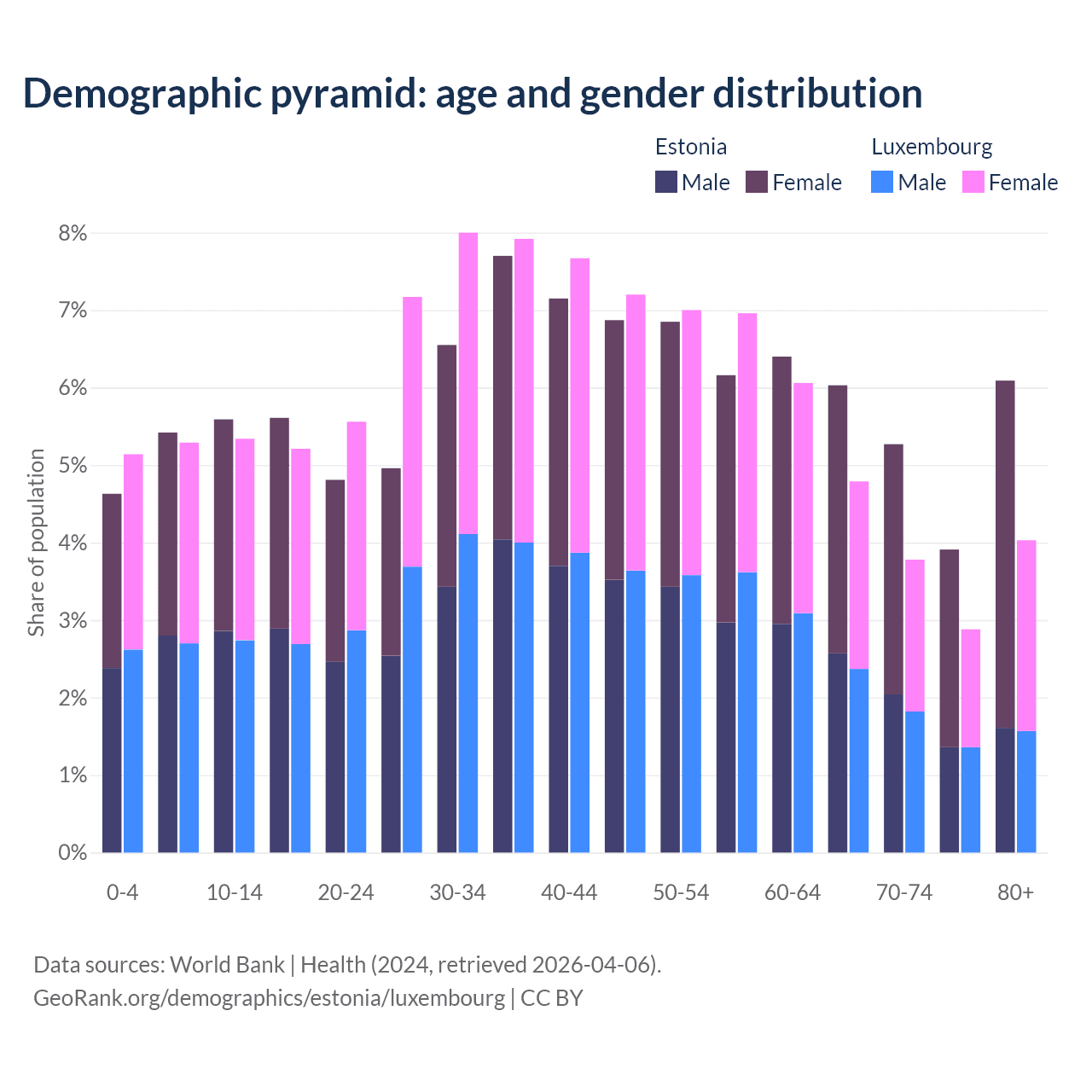- Estonia is ranked 25/196 by median age (oldest to youngest) vs 46/196 for Luxembourg.