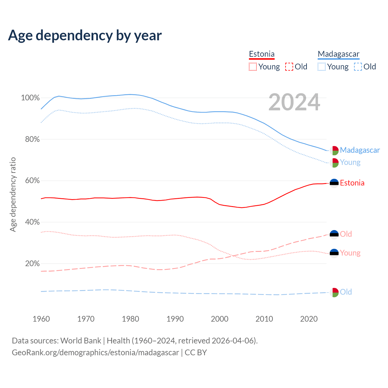 Data sources: World Bank | Health (1960–2024, retrieved 2026-04-06); U.S. Census Bureau (1960–2024, retrieved 2026-02-08).