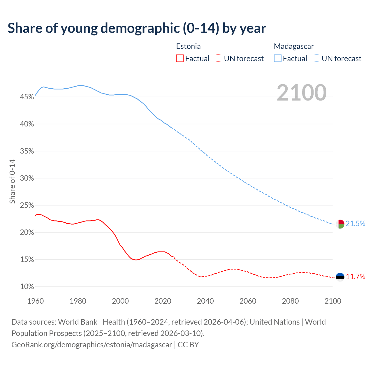 - The share of young demographic (0-15 years old) in Estonia is 15.6% vs 39.3% in Madagascar.
