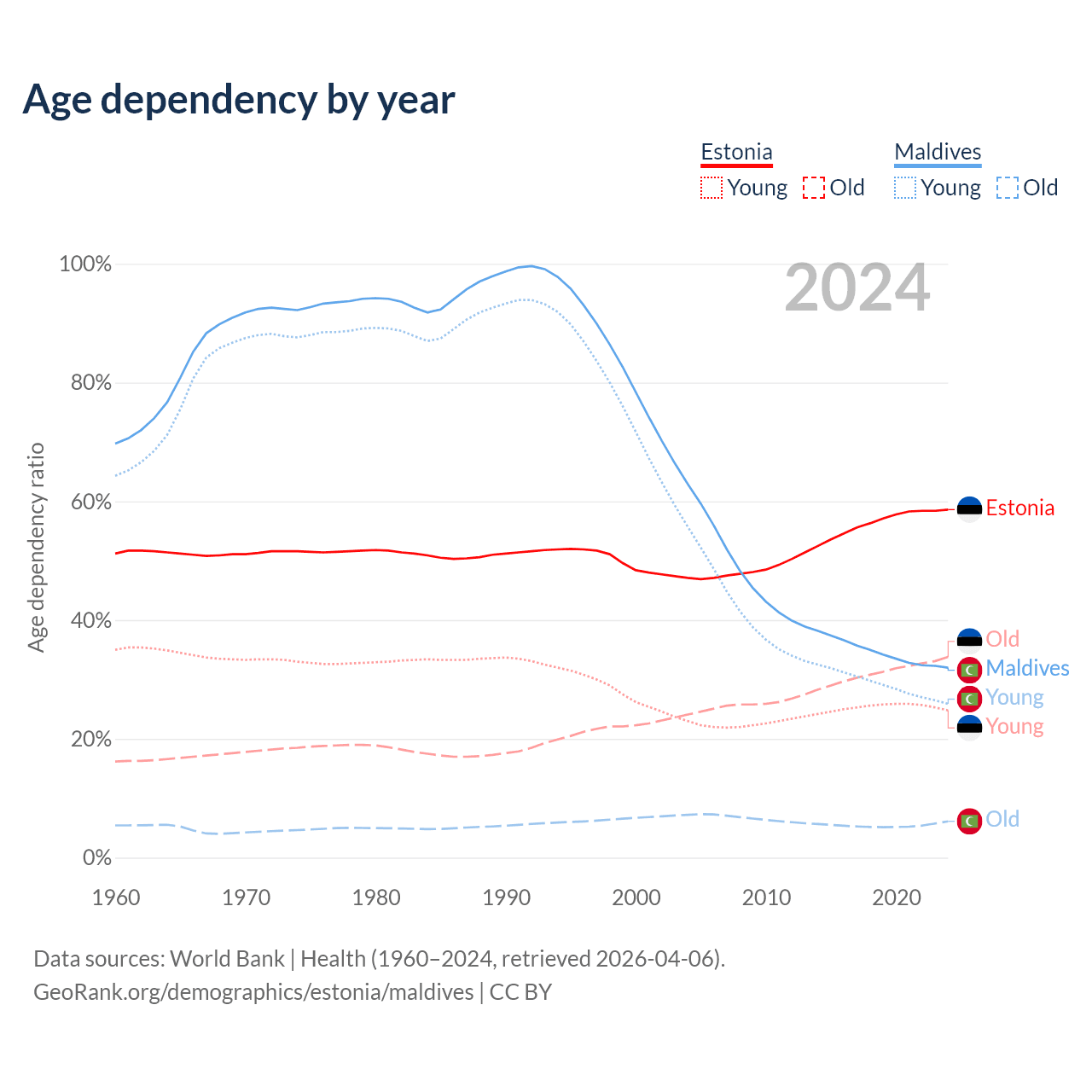 Data sources: World Bank | Health (1960–2024, retrieved 2026-04-06); U.S. Census Bureau (1960–2024, retrieved 2026-02-08).