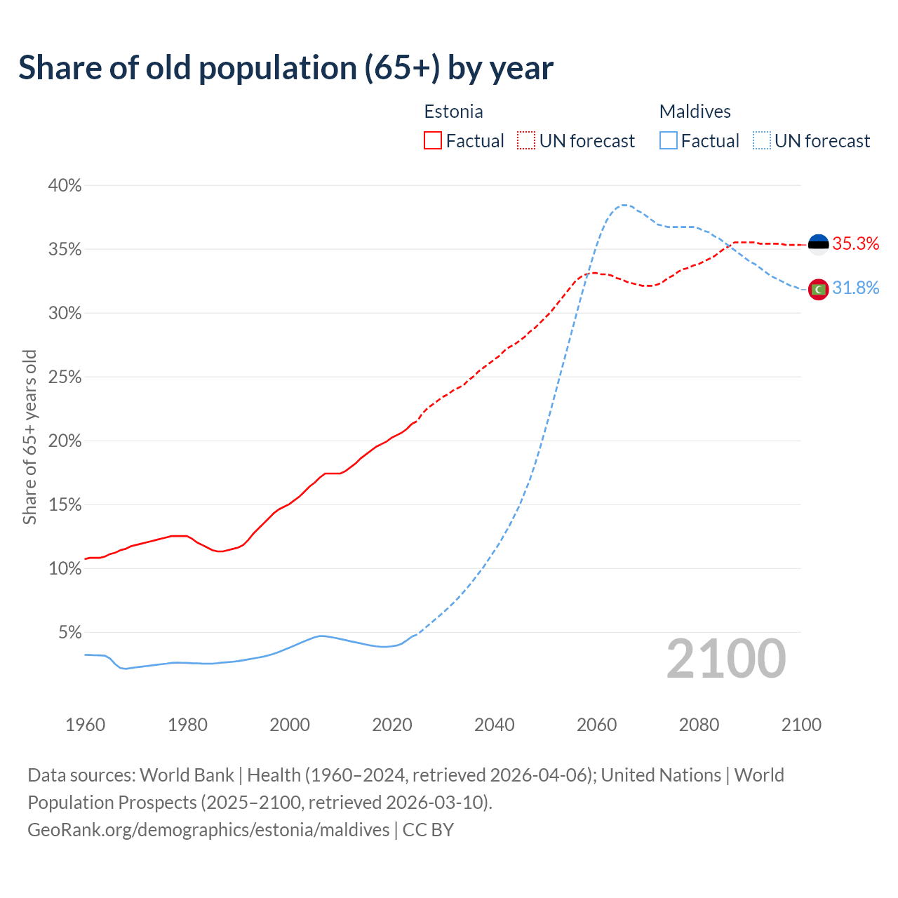 - The share of old-age demographic (65+) in Estonia is 21.3% vs 4.64% in Maldives.