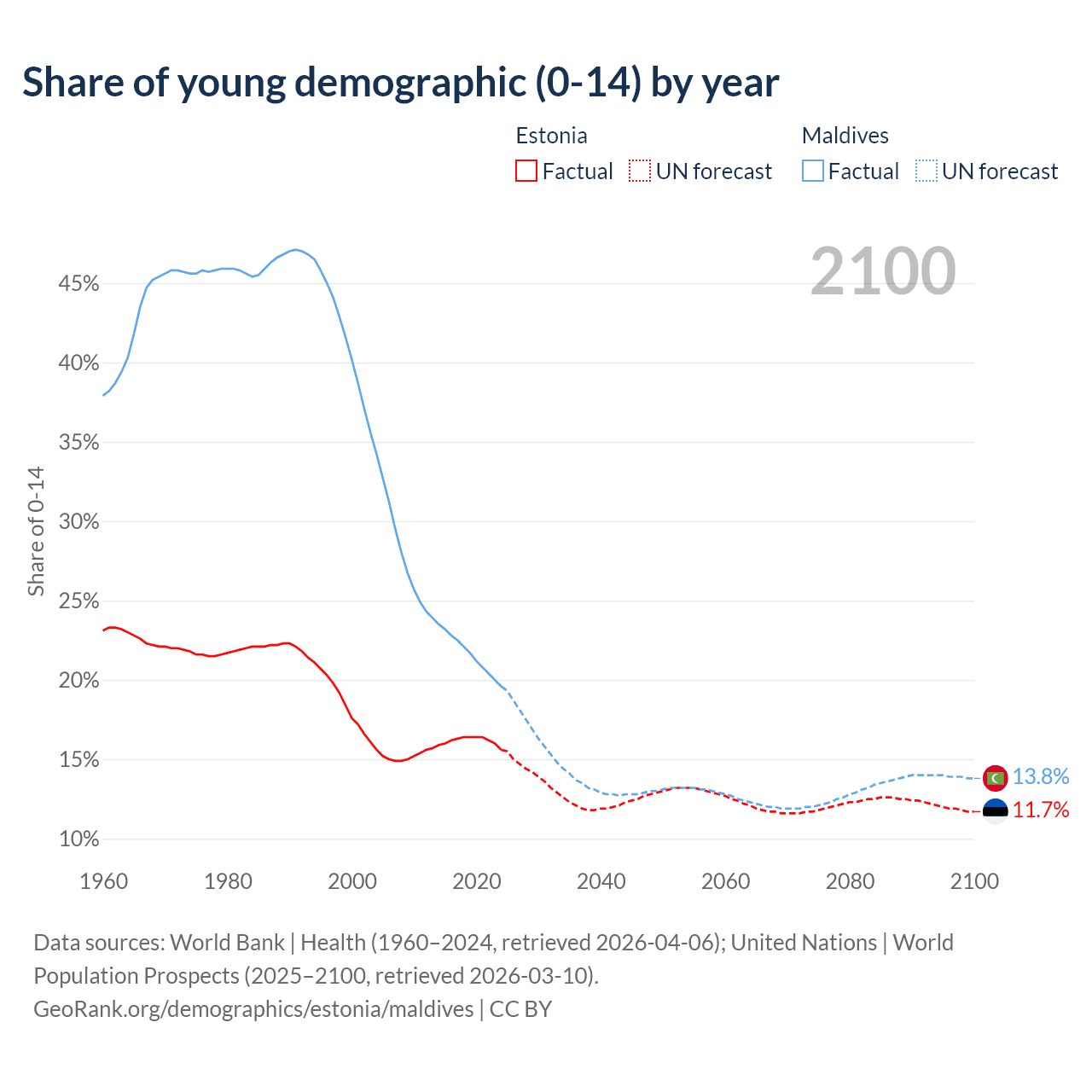 - The share of young demographic (0-15 years old) in Estonia is 15.6% vs 19.6% in Maldives.