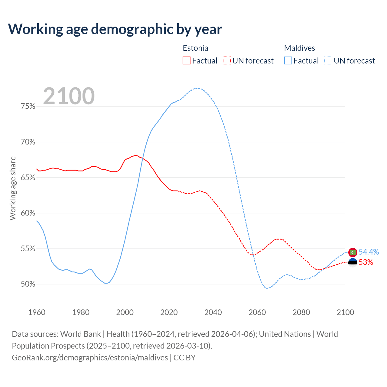 Median age Estonia vs Maldives, 1960-2100
