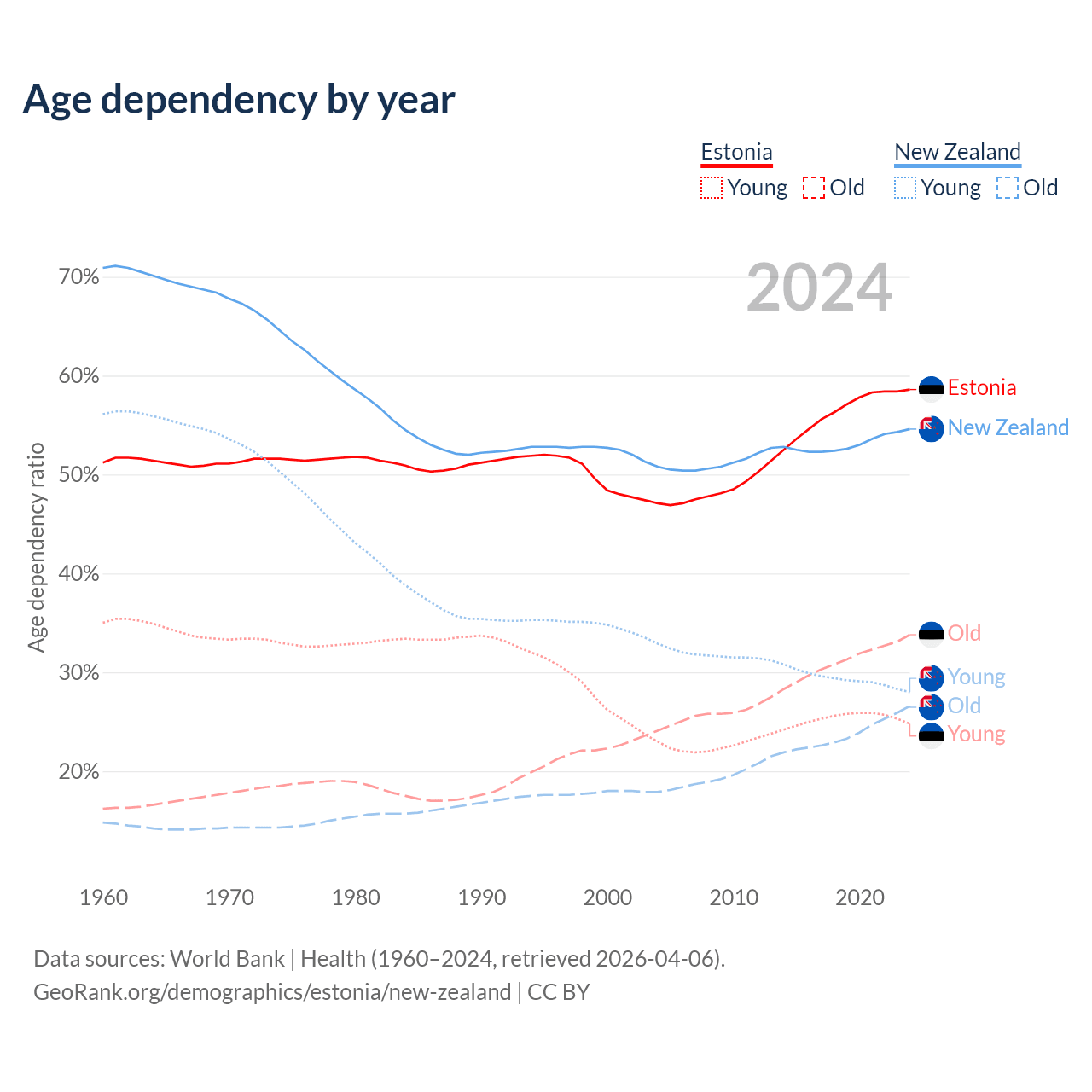 - The share of old-age demographic (65+) in Estonia is 21.3% vs 17.2% in New Zealand.