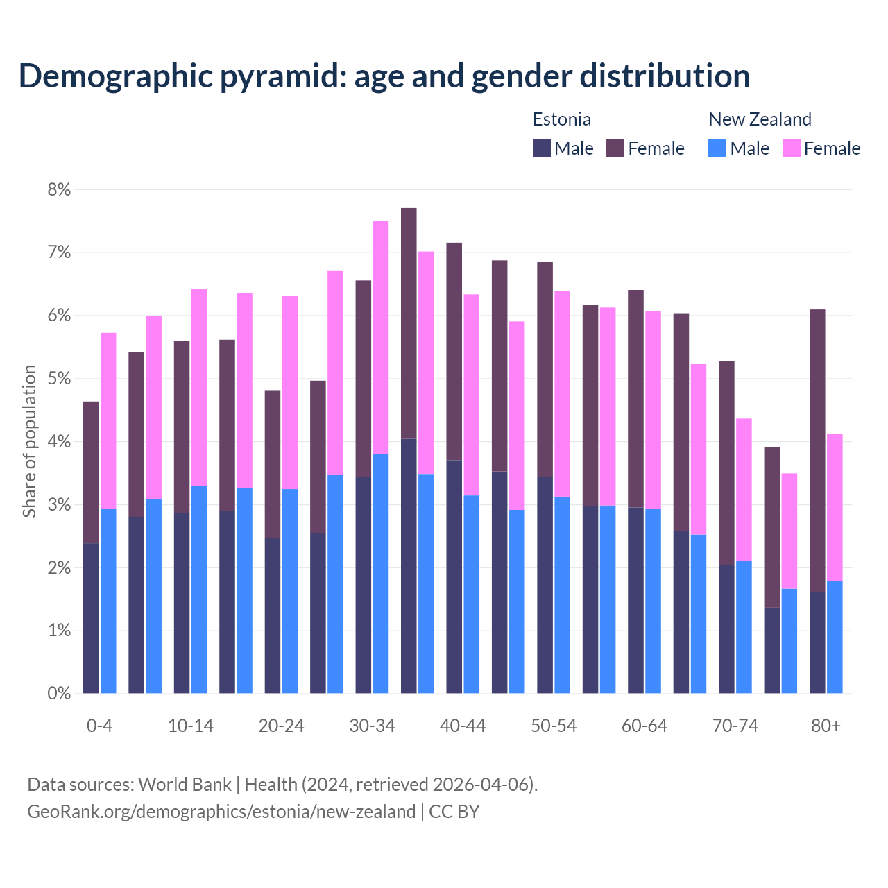 - Estonia is ranked 25/196 by median age (oldest to youngest) vs 56/196 for New Zealand.