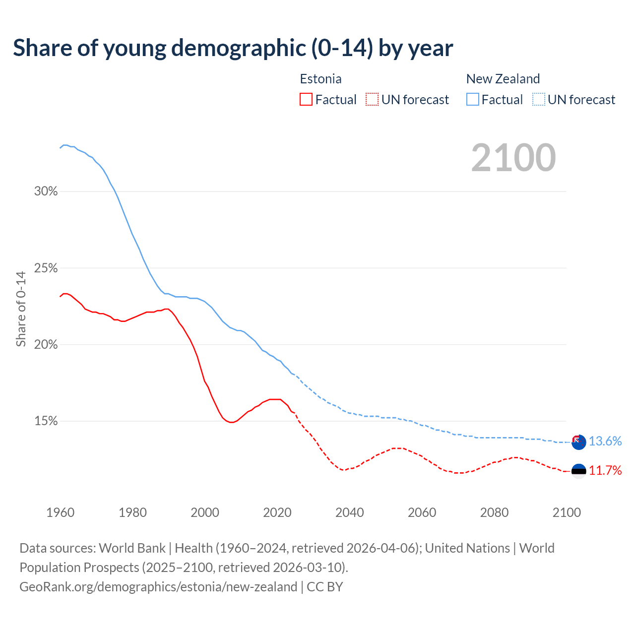 - The share of young demographic (0-15 years old) in Estonia is 15.6% vs 18.1% in New Zealand.