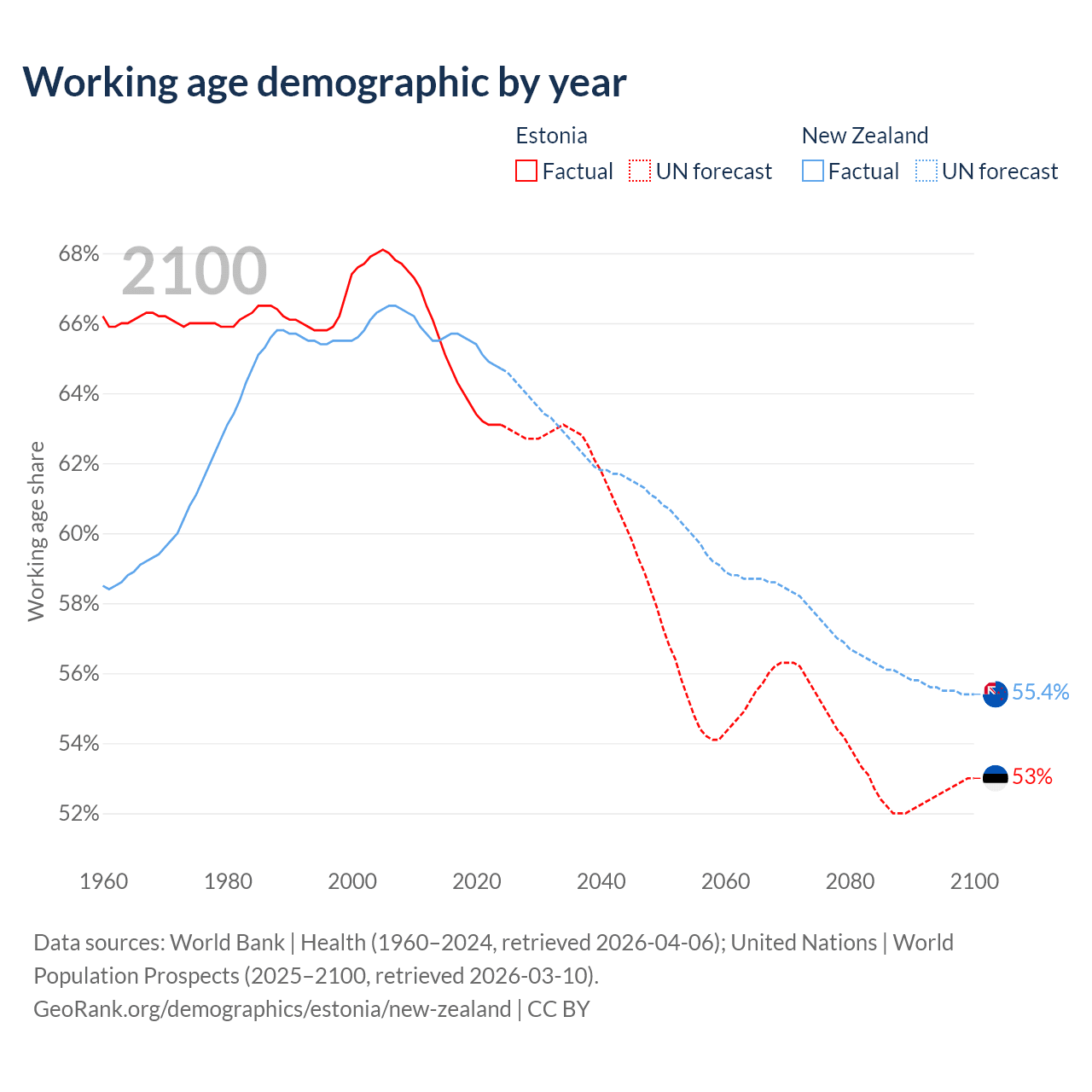- Estonia has 845K working age adults (aged 15-64) vs 3.48M in New Zealand.