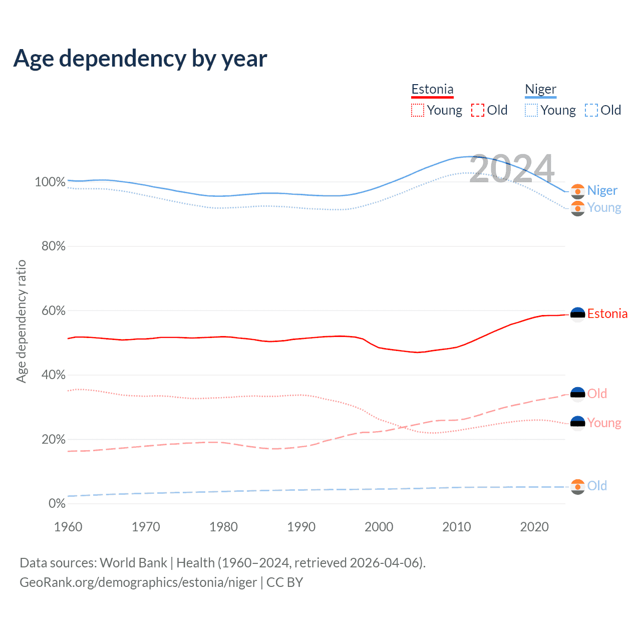 Data sources: World Bank | Health (1960–2024, retrieved 2026-04-06); U.S. Census Bureau (1960–2024, retrieved 2026-02-08).