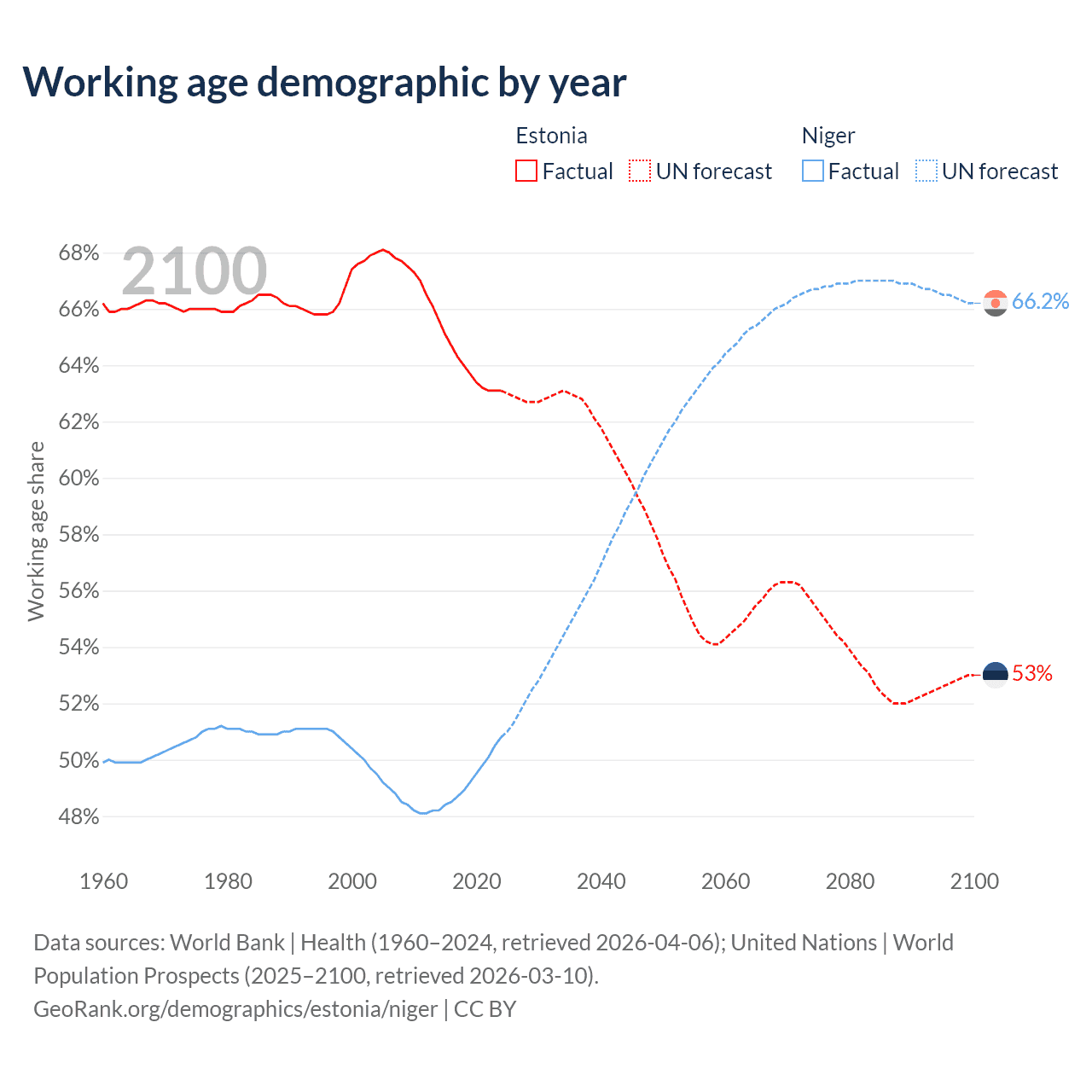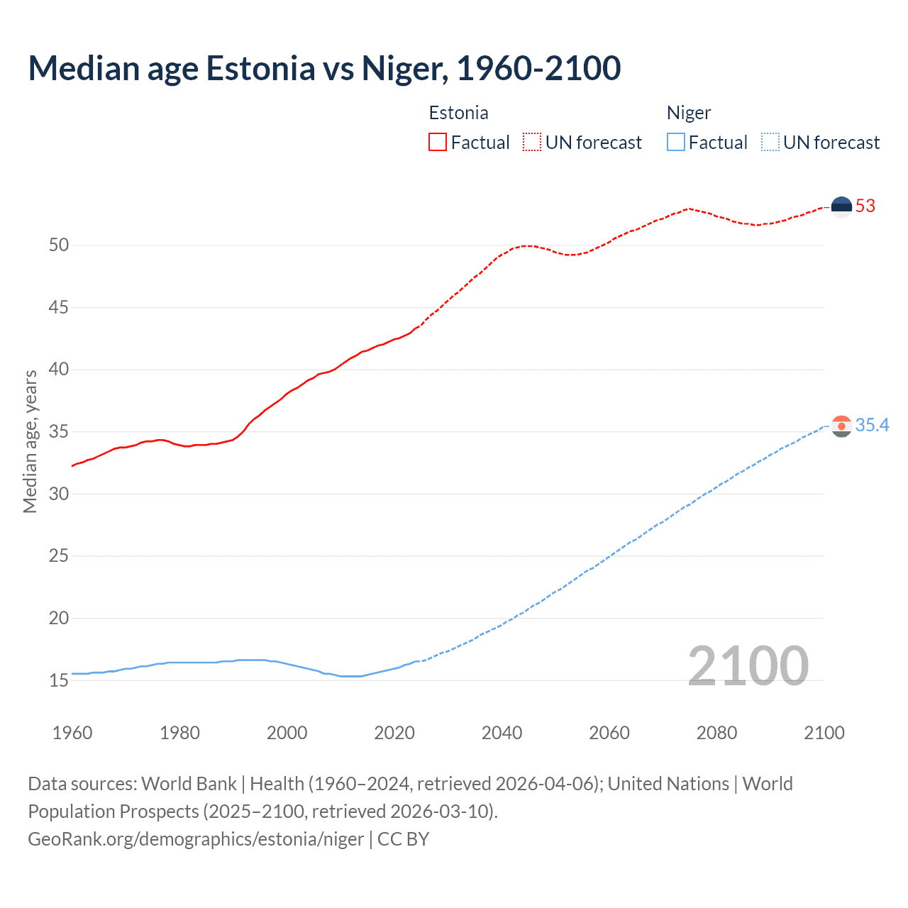 Median age Estonia vs Niger, 1960-2100