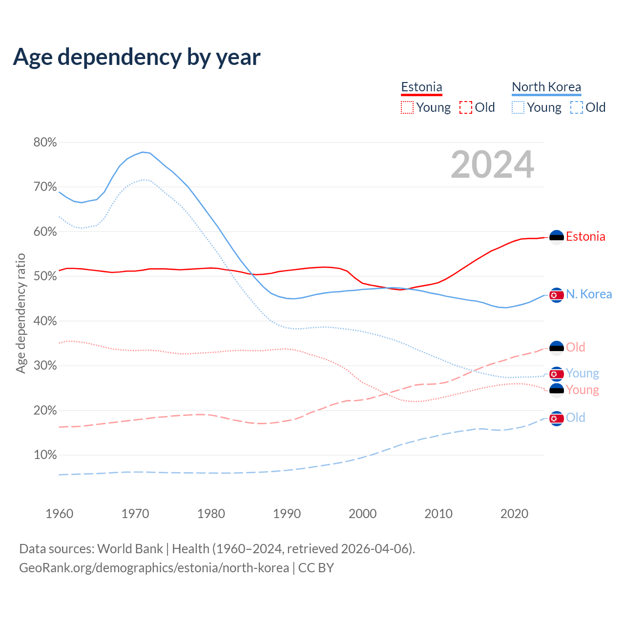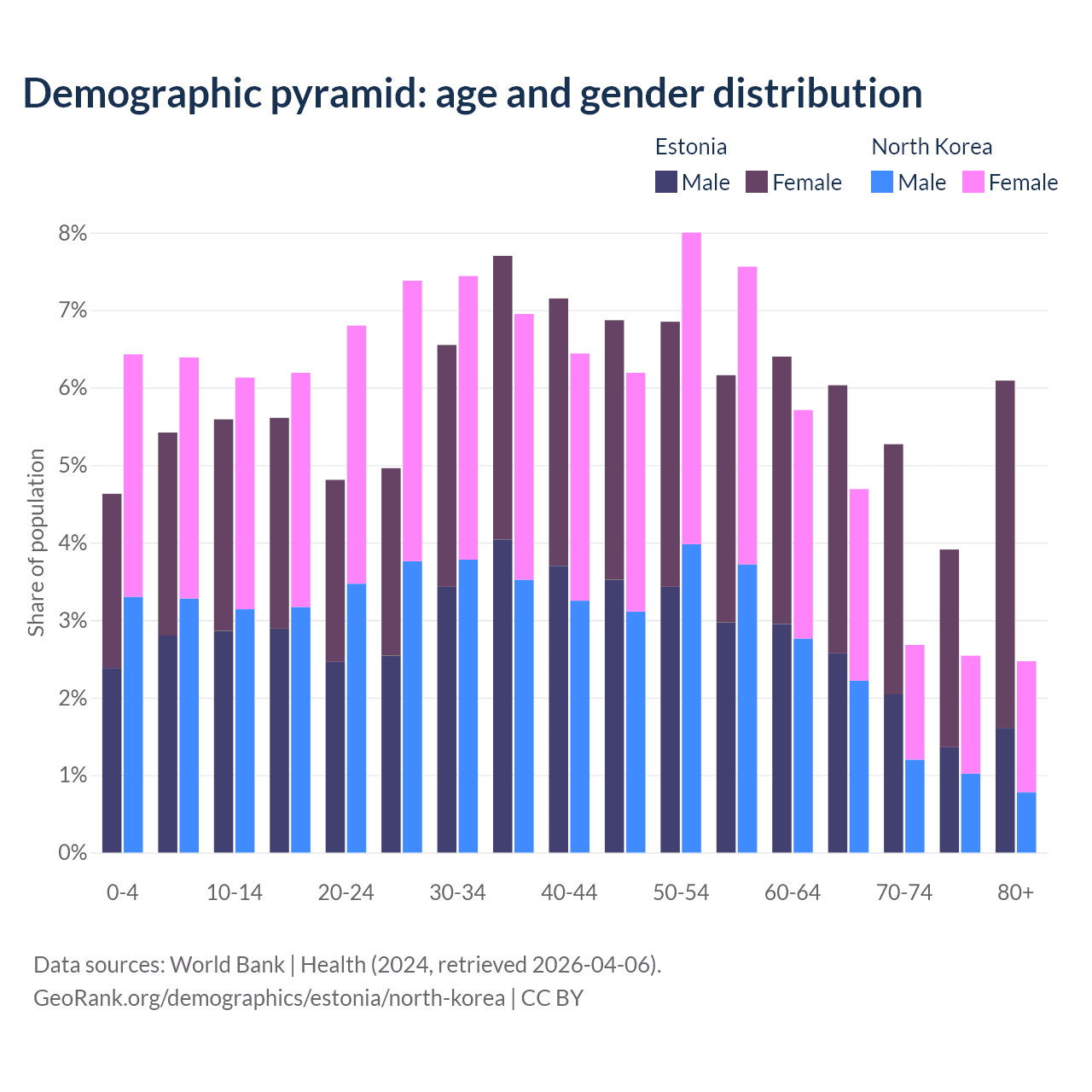 - The share of old-age demographic (65+) in Estonia is 21.3% vs 12.4% in North Korea.