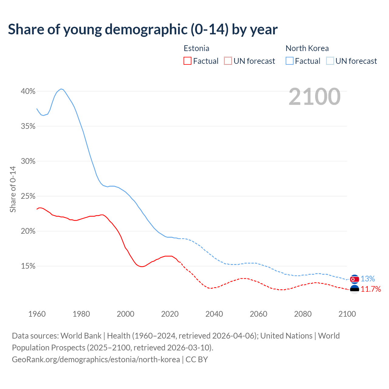 - The share of young demographic (0-15 years old) in Estonia is 15.6% vs 18.9% in North Korea.