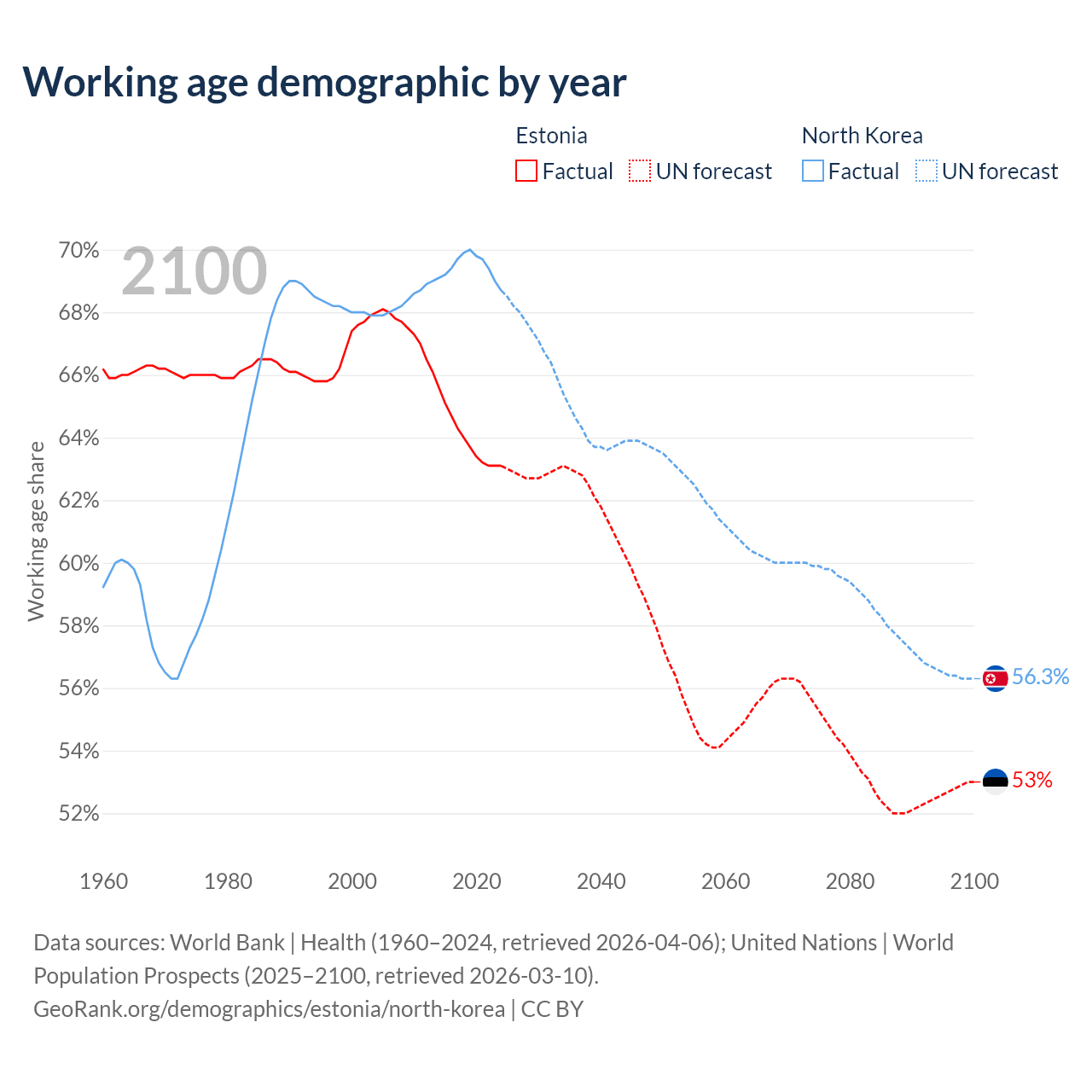 - Estonia has 845K working age adults (aged 15-64) vs 18.3M in North Korea.