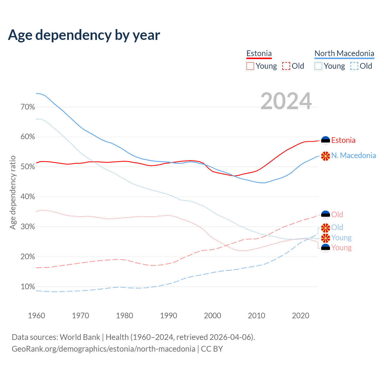 Data sources: World Bank | Health (1960–2024, retrieved 2026-04-06); U.S. Census Bureau (1960–2024, retrieved 2026-02-08).