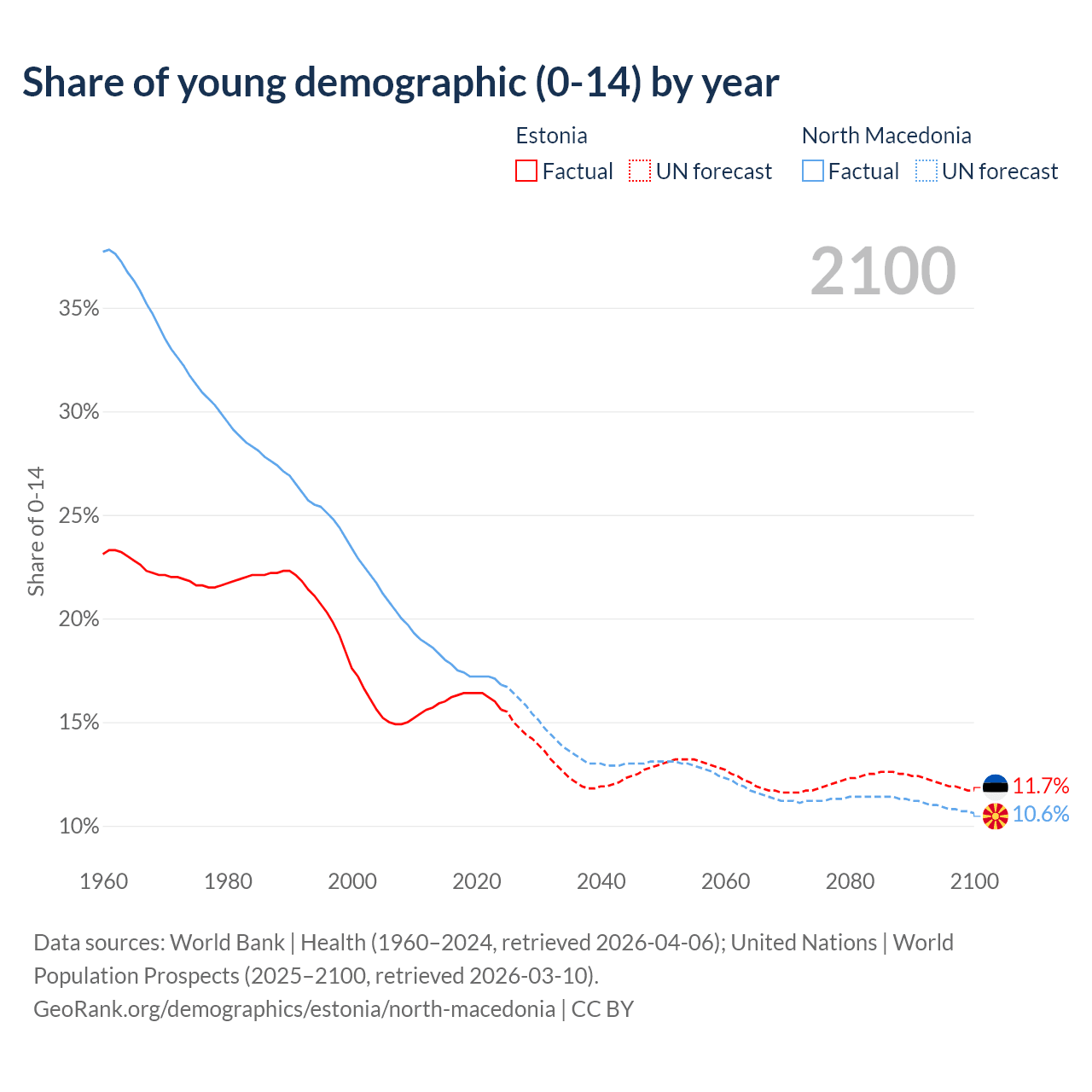 - The share of young demographic (0-15 years old) in Estonia is 15.6% vs 16.8% in North Macedonia.