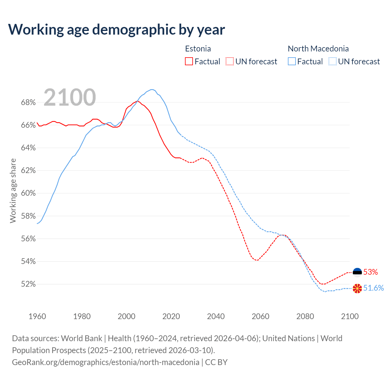 Median age Estonia vs North Macedonia, 1960-2100