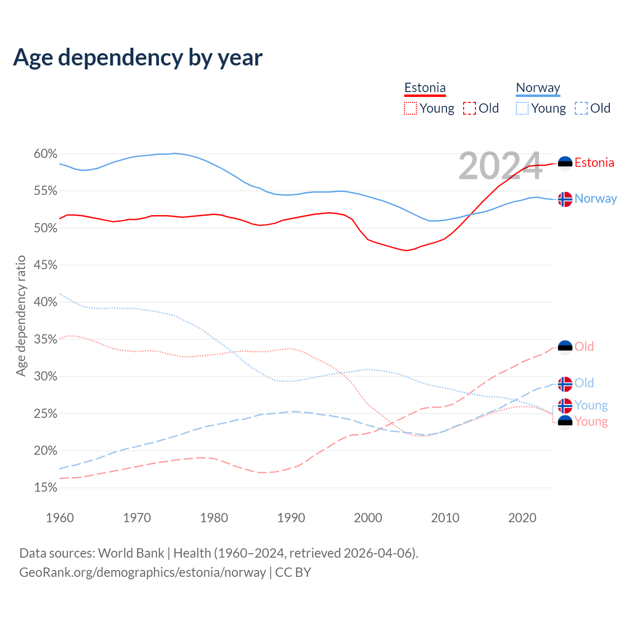 Data sources: World Bank | Health (1960–2024, retrieved 2026-04-06); U.S. Census Bureau (1960–2024, retrieved 2026-02-08).