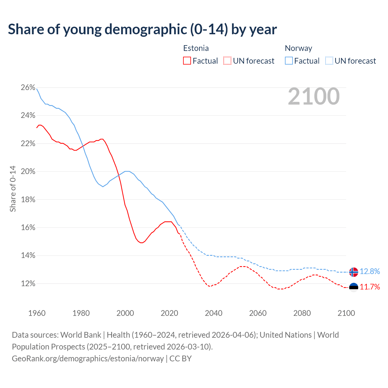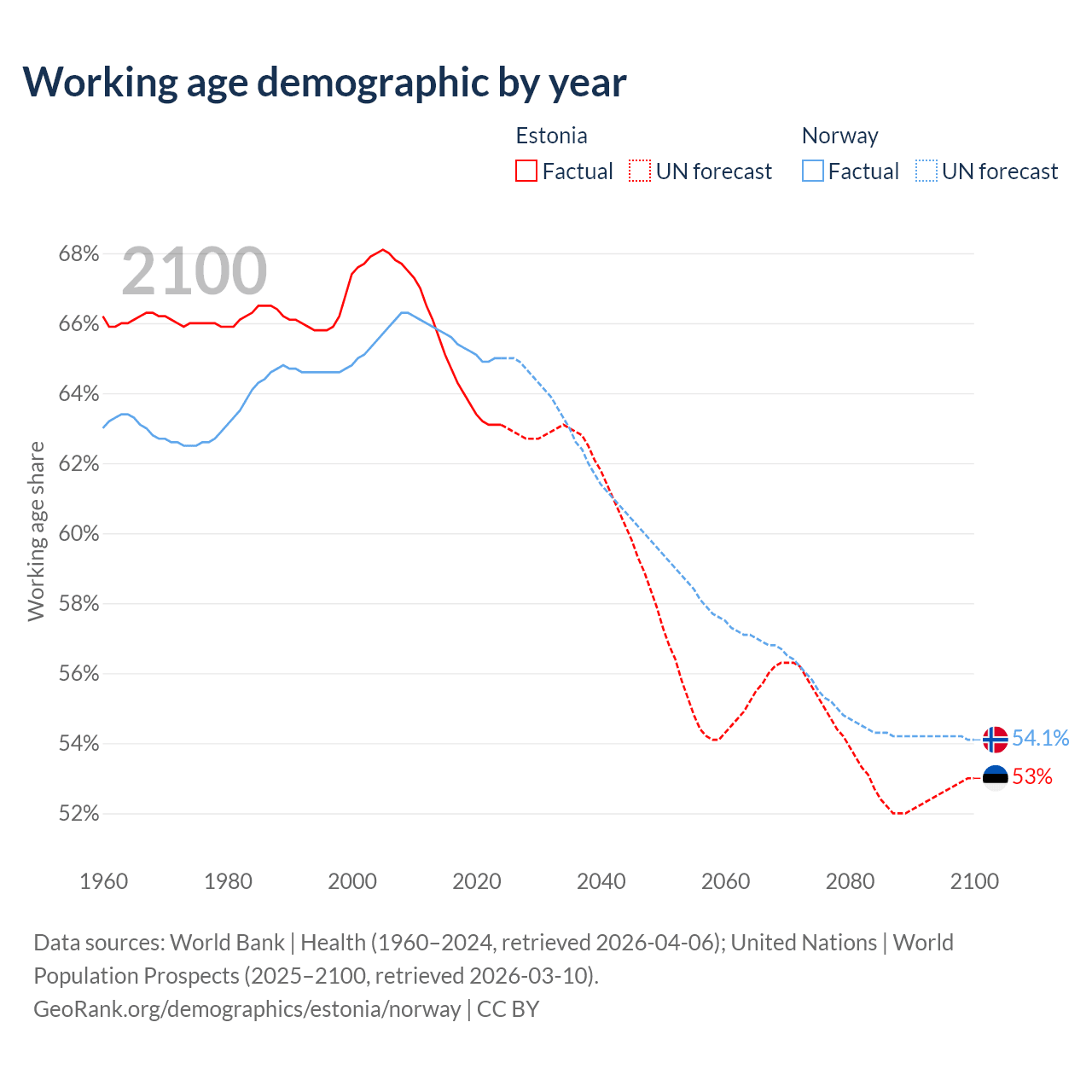 Median age Estonia vs Norway, 1960-2100