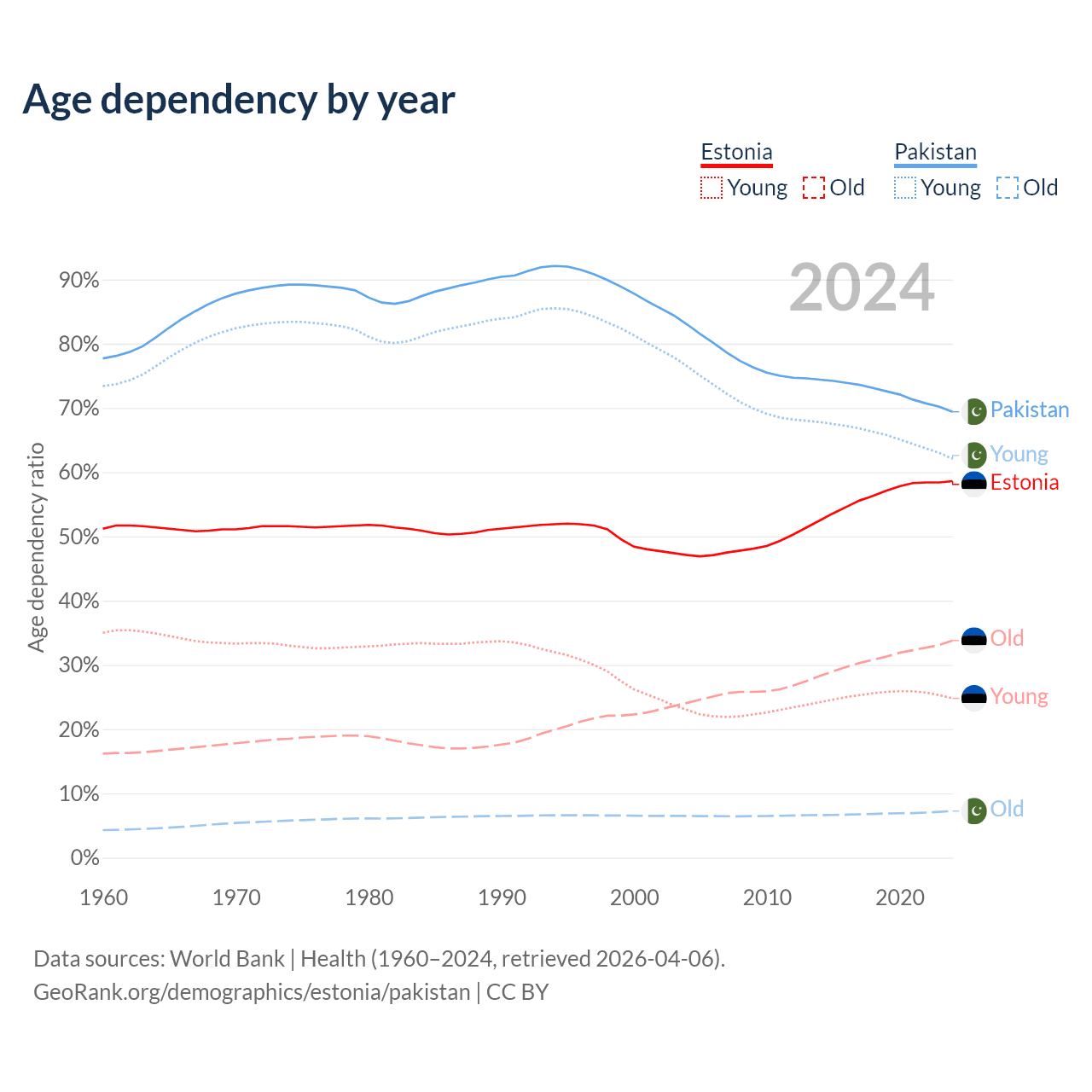- Estonia is ranked 25/196 by median age (oldest to youngest) vs 154/196 for Pakistan.