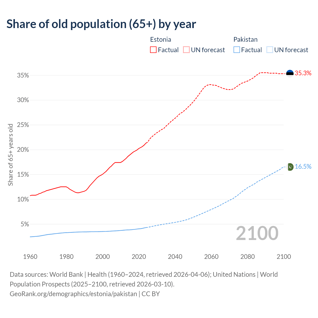 - The share of old-age demographic (65+) in Estonia is 21.3% vs 4.28% in Pakistan.