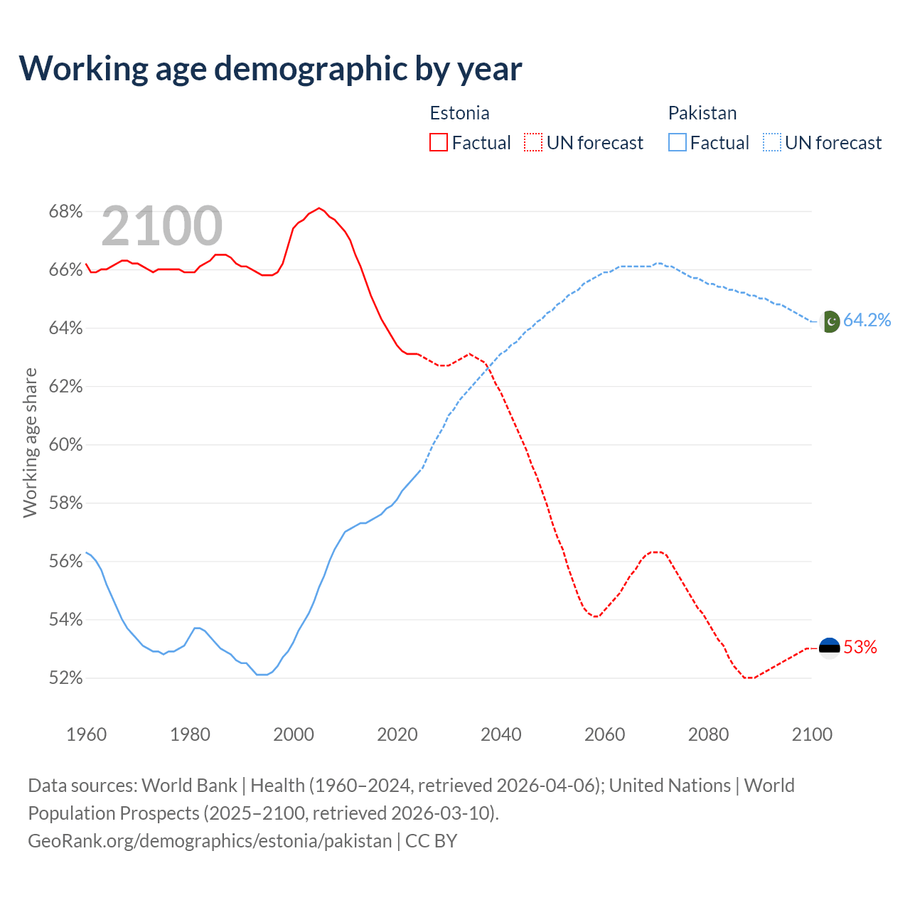 Median age Estonia vs Pakistan, 1960-2100