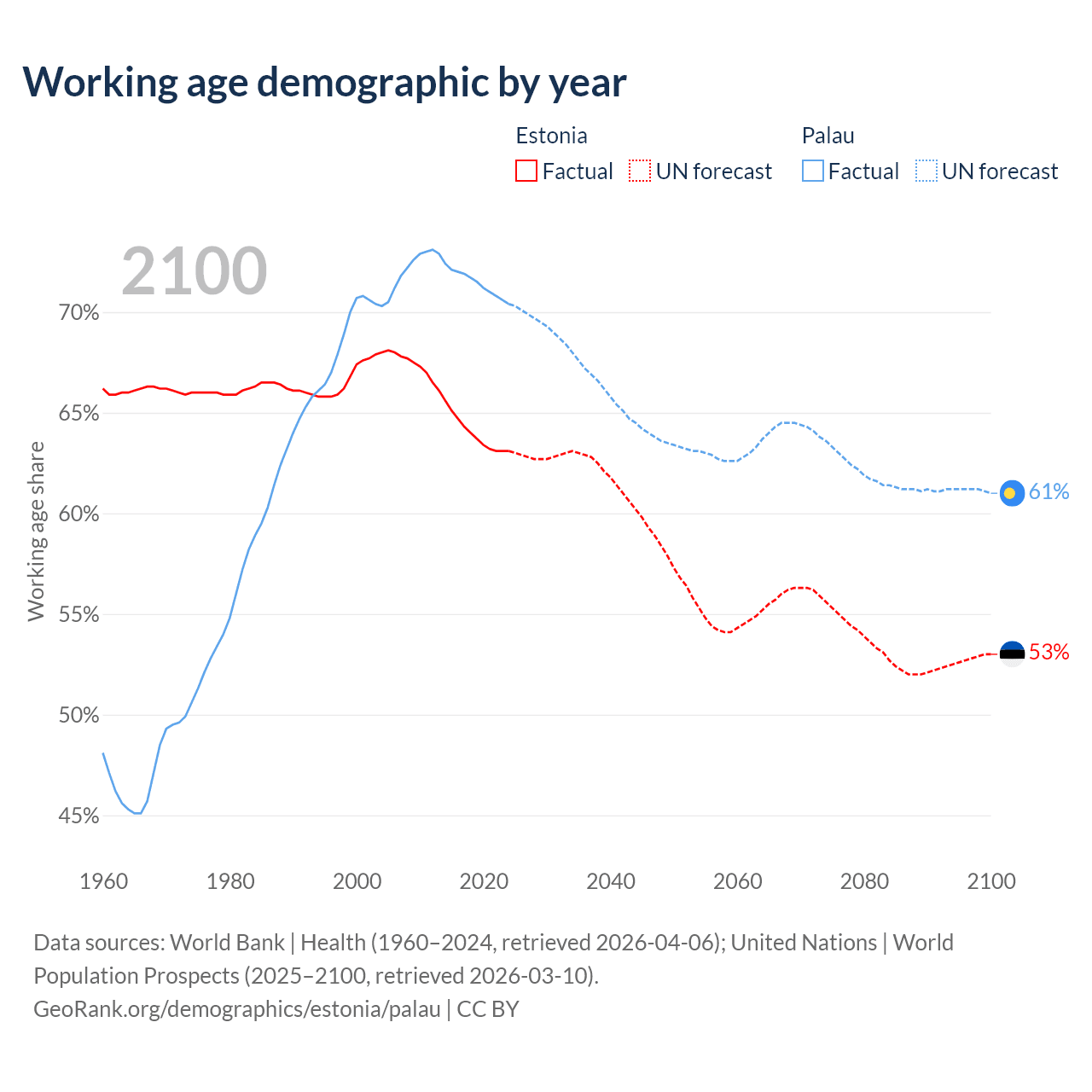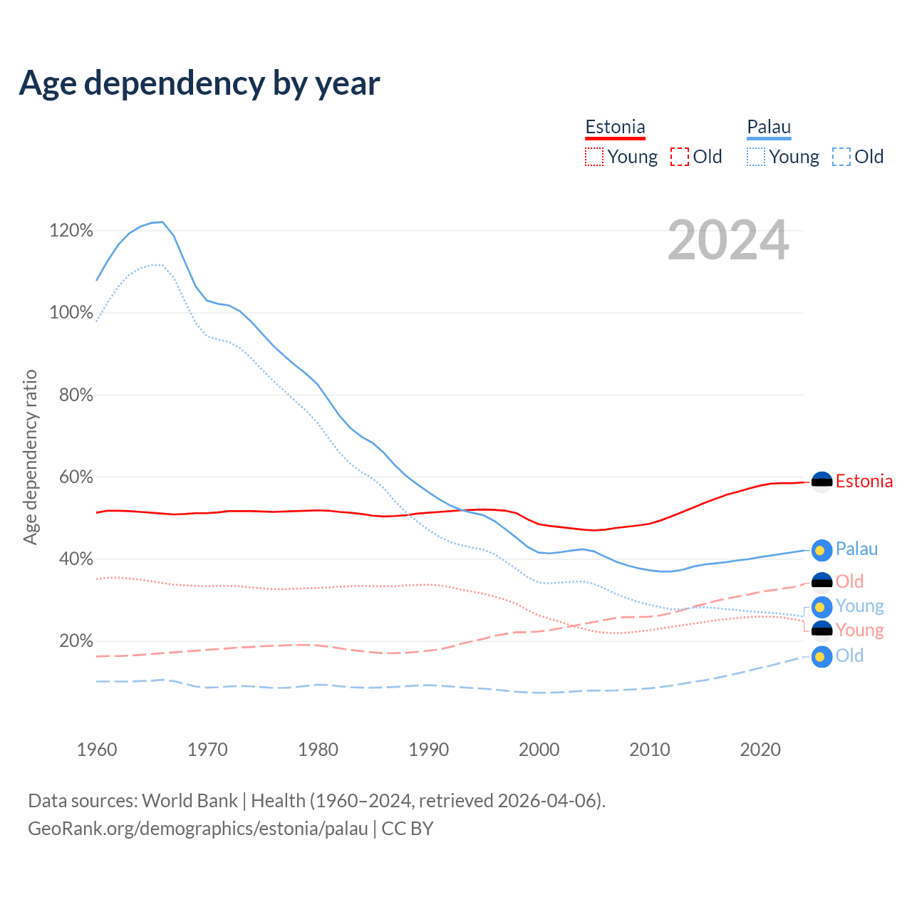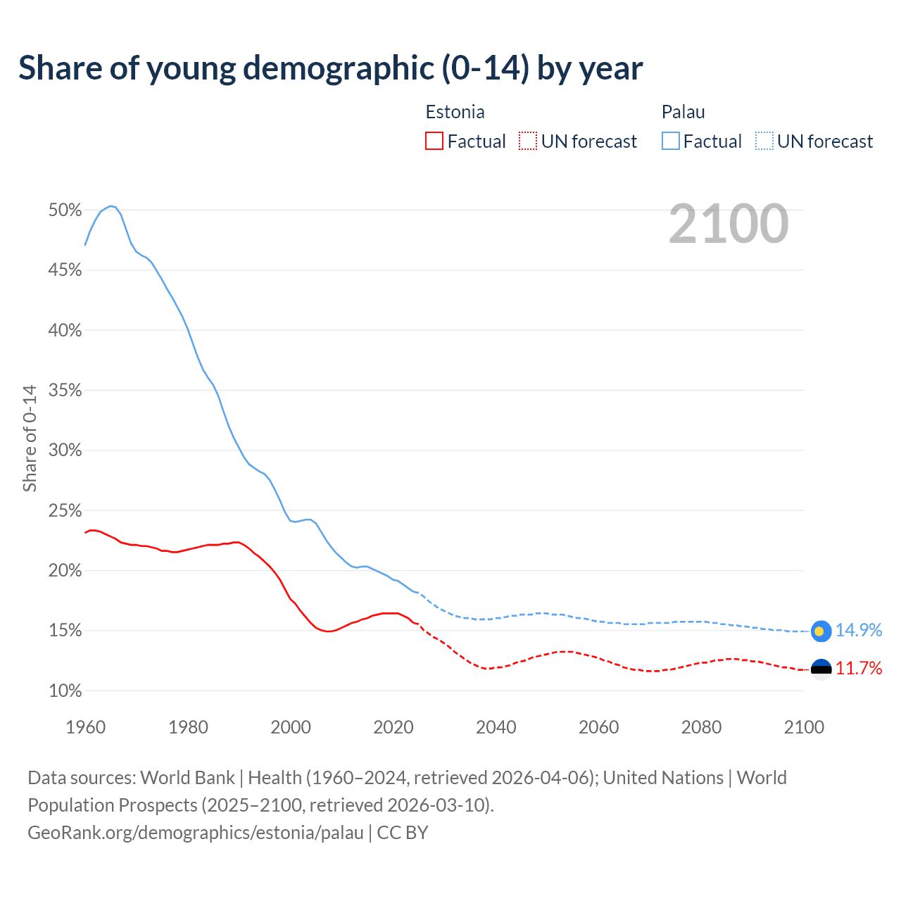 - The share of young demographic (0-15 years old) in Estonia is 15.6% vs 18.2% in Palau.