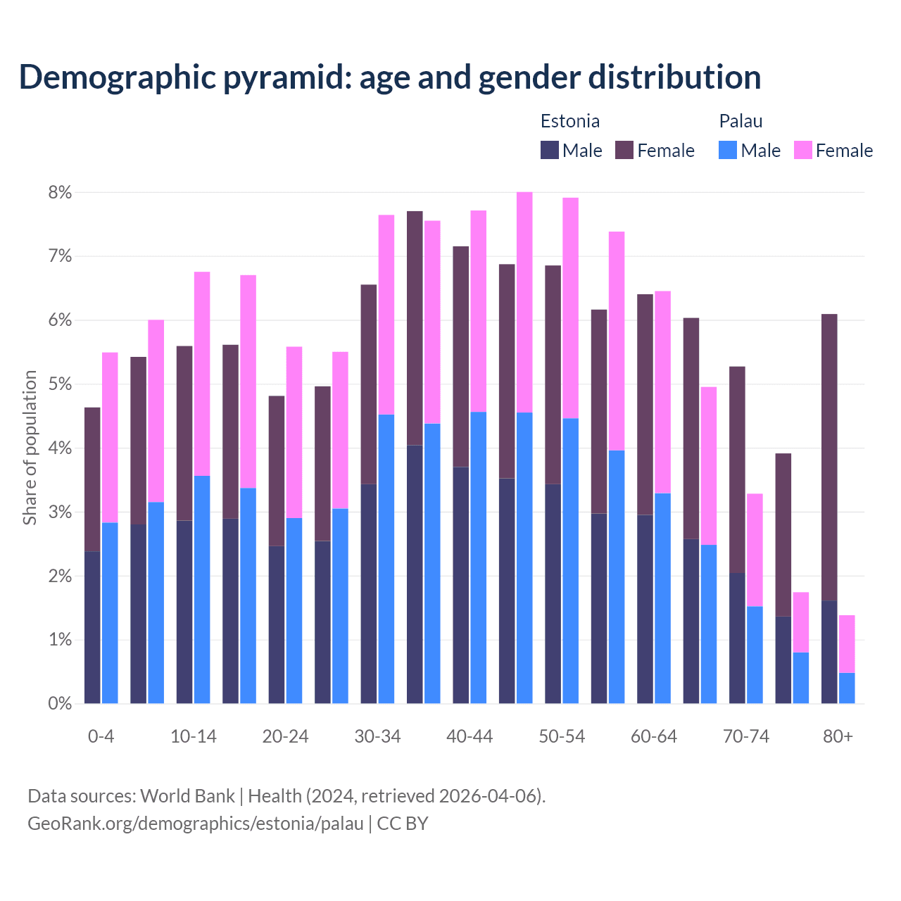 - As of 2026, the population of Estonia is 1.34M vs 17.6K in Palau - 76 times difference.