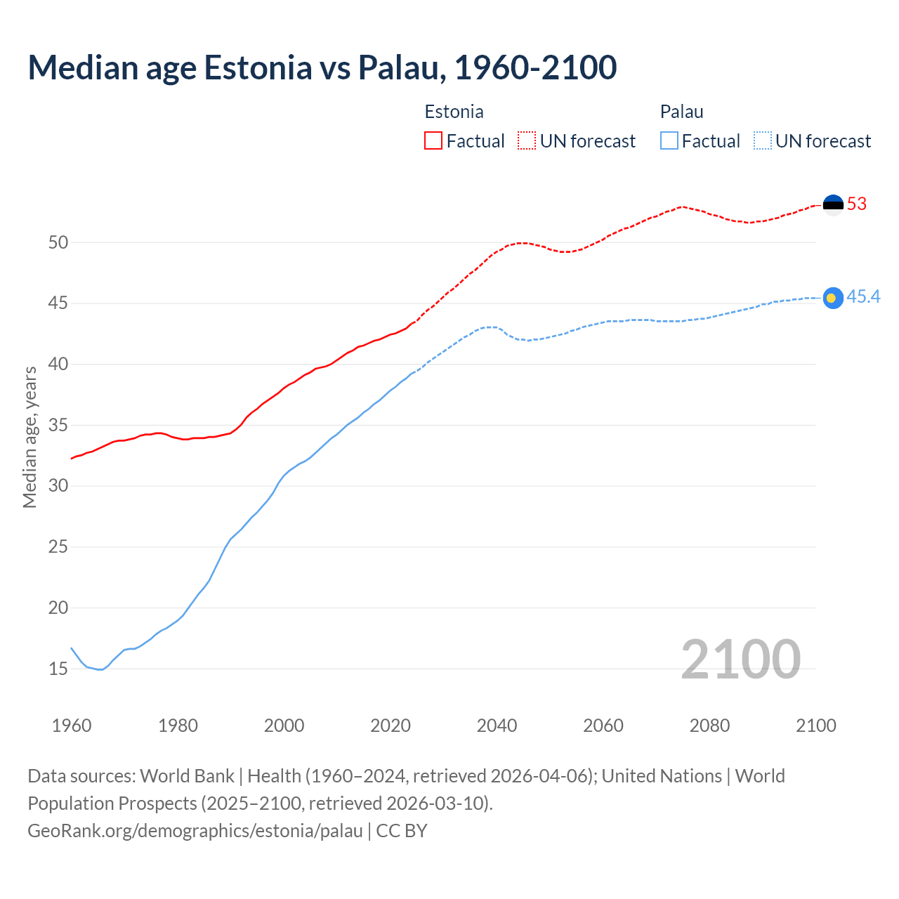 - Estonia is ranked 25/196 by median age (oldest to youngest) vs 53/196 for Palau.