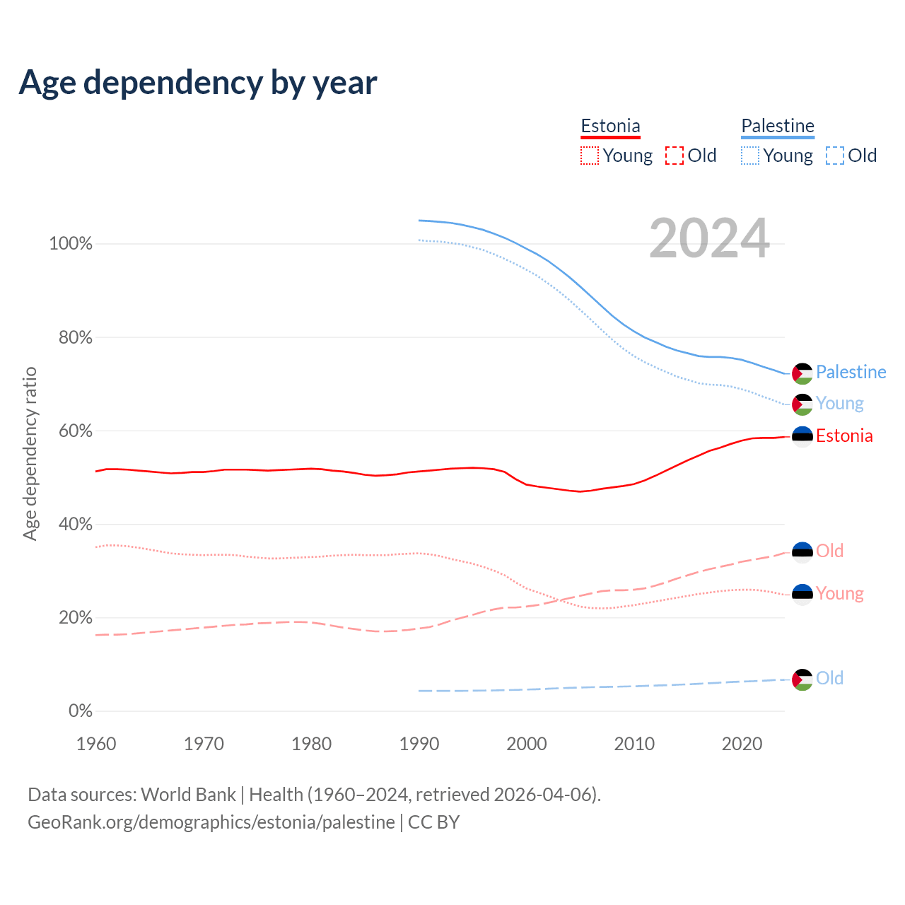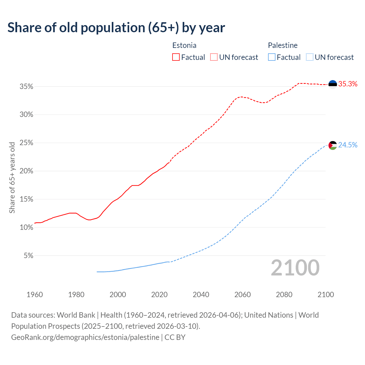 - The share of old-age demographic (65+) in Estonia is 21.3% vs 3.84% in Palestine.