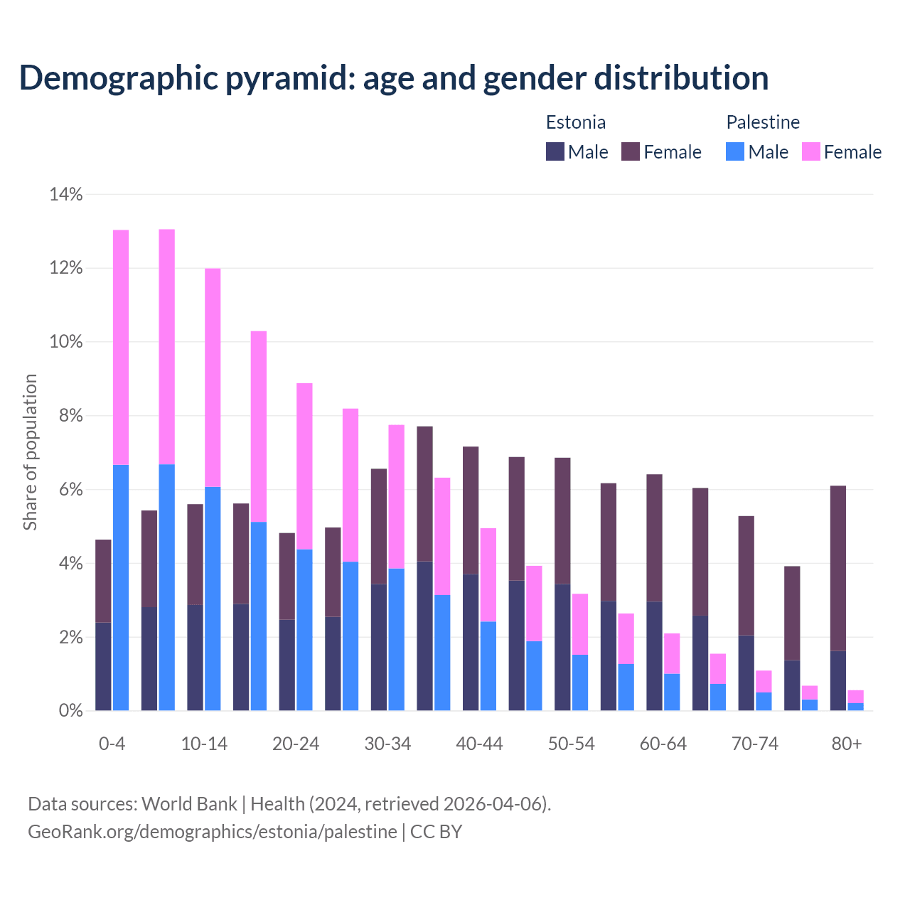 - As of 2026, the population of Estonia is 1.34M vs 5.5M in Palestine - 4.11 times difference.