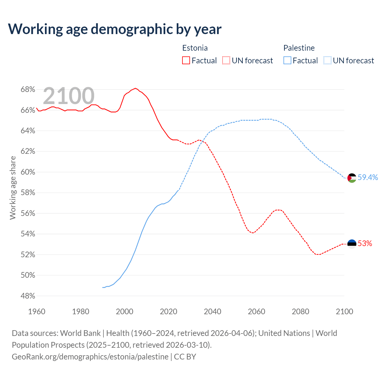 - Estonia has 845K working age adults (aged 15-64) vs 3.2M in Palestine.