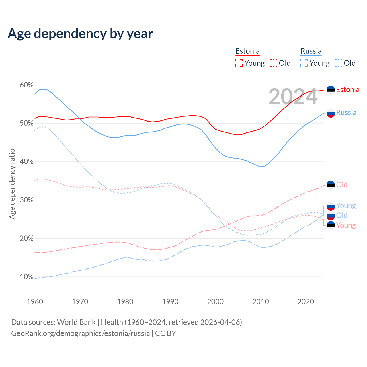 - The share of old-age demographic (65+) in Estonia is 21.3% vs 17.2% in Russia.