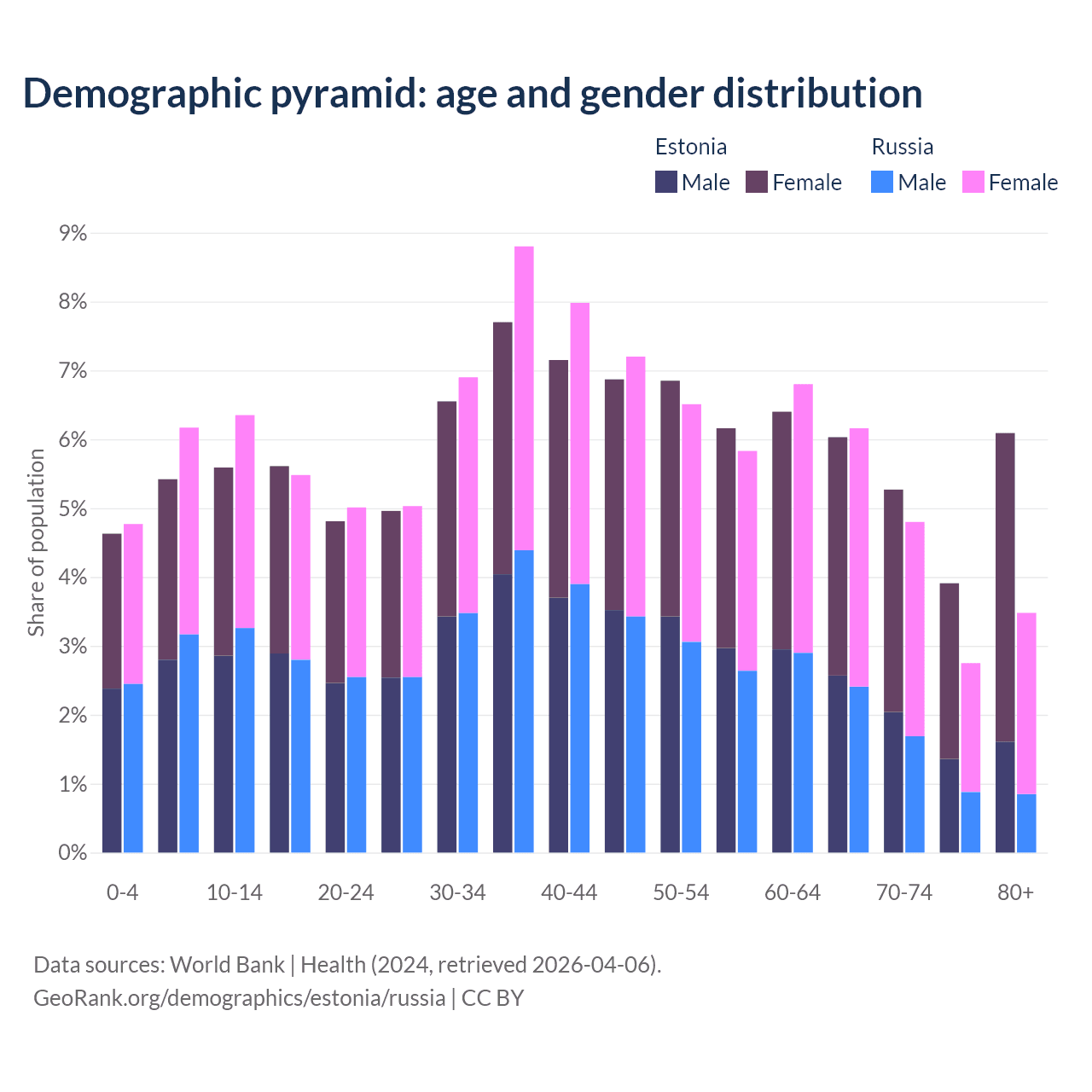 - Estonia is ranked 25/196 by median age (oldest to youngest) vs 42/196 for Russia.