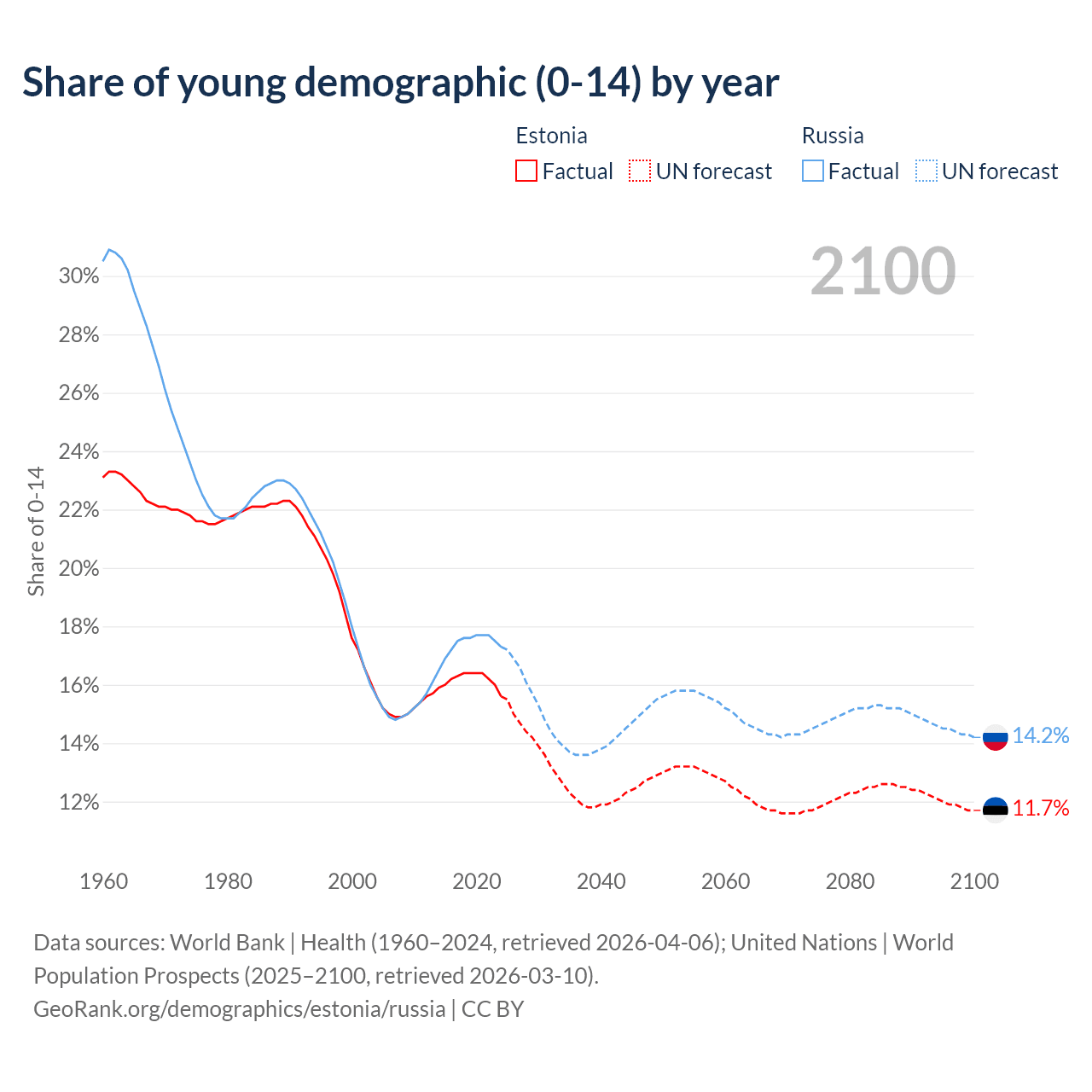 - The share of young demographic (0-15 years old) in Estonia is 15.6% vs 17.3% in Russia.