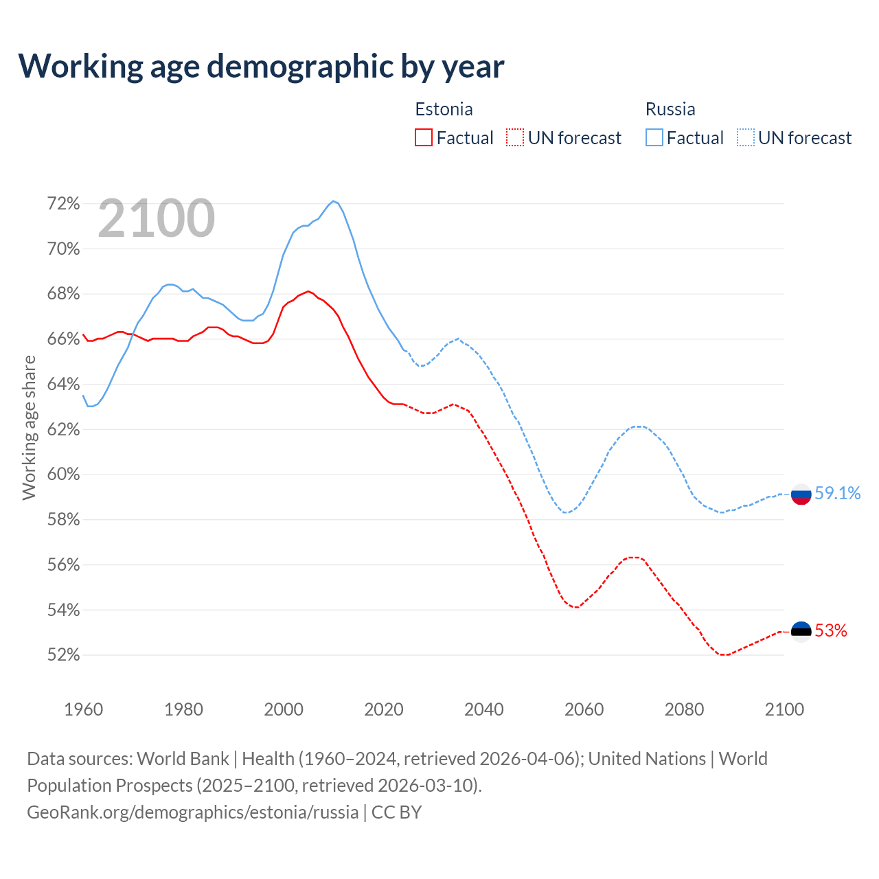 - Estonia has 845K working age adults (aged 15-64) vs 93M in Russia.