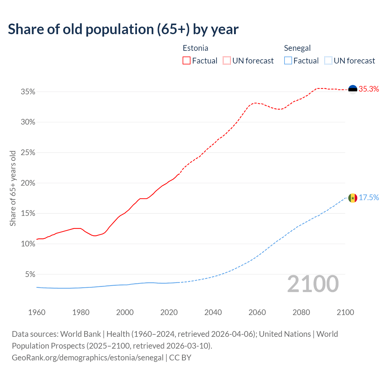 The share of older people aged 65 and over is 21.3% in Estonia and 3.62% in Senegal. Life expectancy in Estonia compared to Senegal .