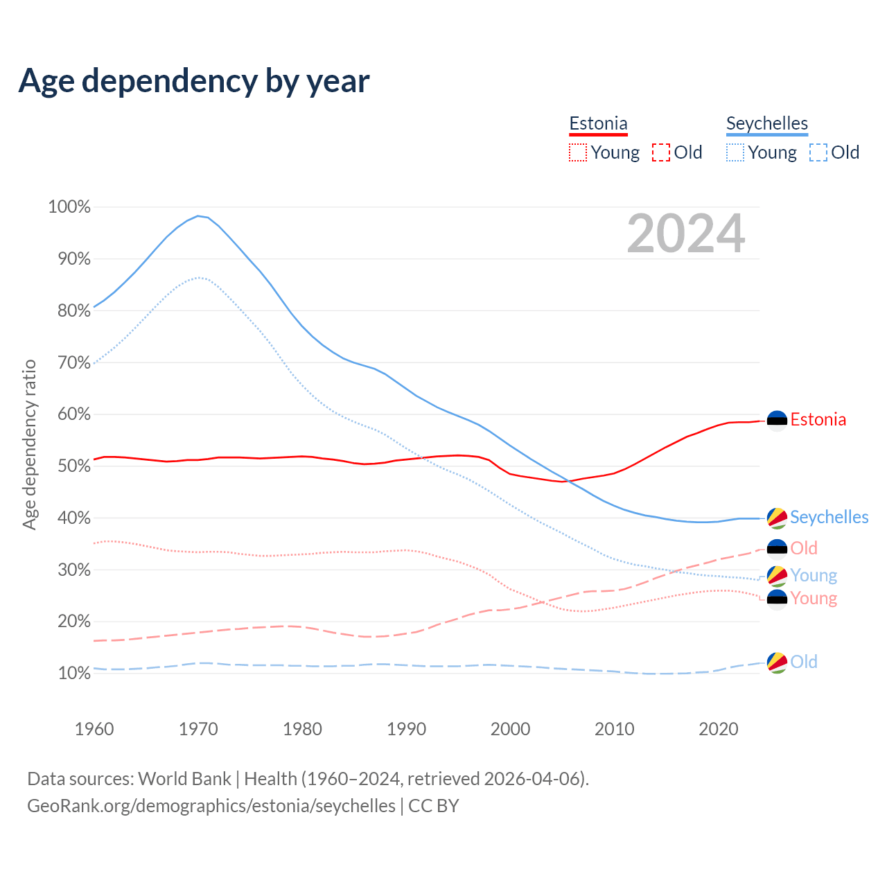 - Estonia is ranked 25/196 by median age (oldest to youngest) vs 76/196 for the Seychelles.