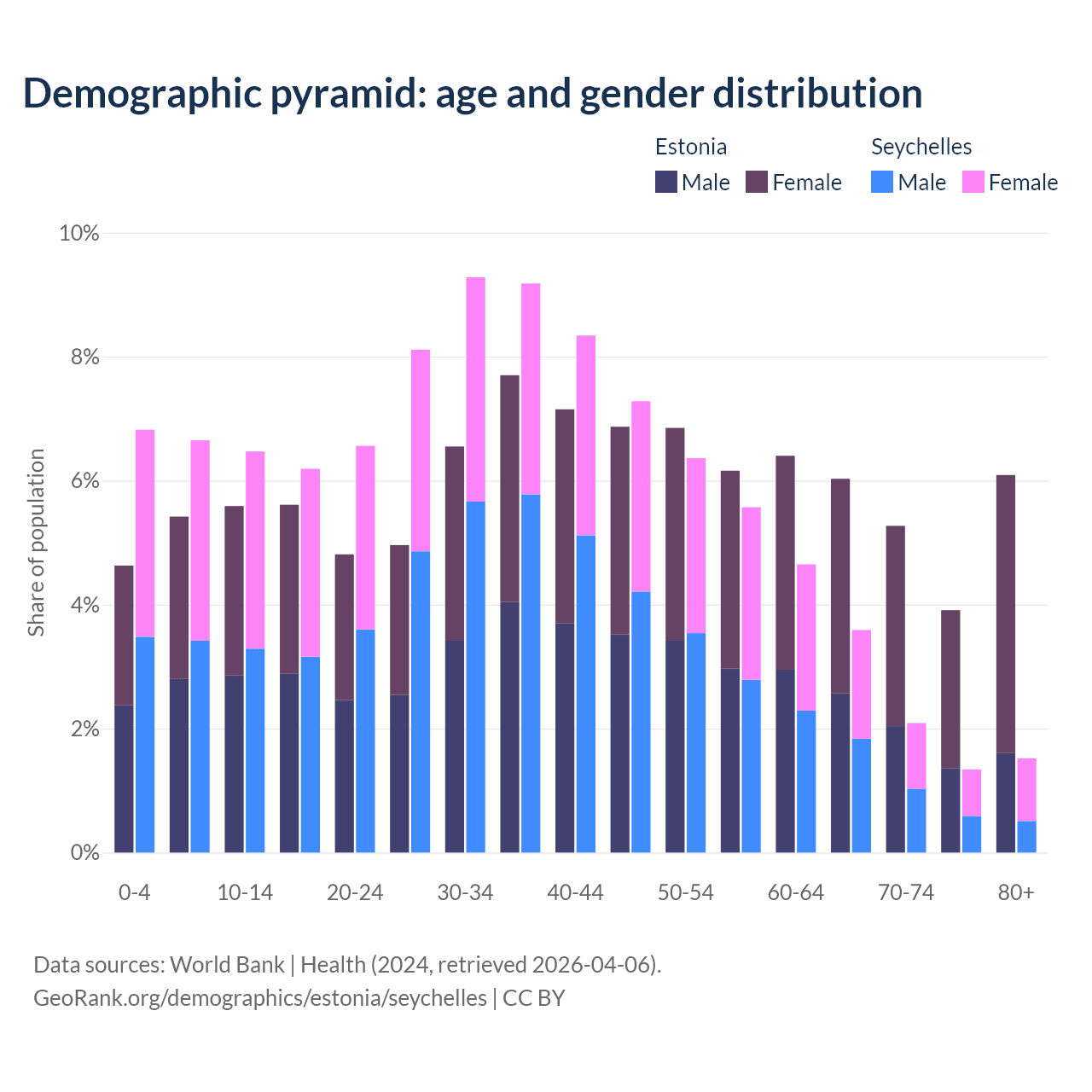- As of 2026, the population of Estonia is 1.34M vs 126K in the Seychelles - 10.6 times difference.