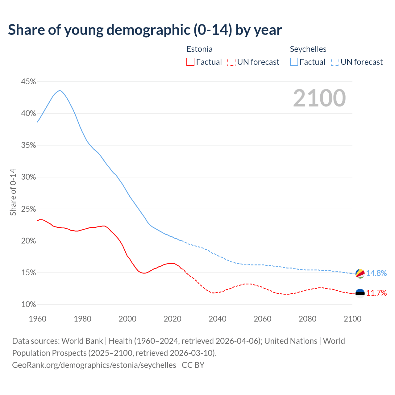 - The share of young demographic (0-15 years old) in Estonia is 15.6% vs 20% in the Seychelles.