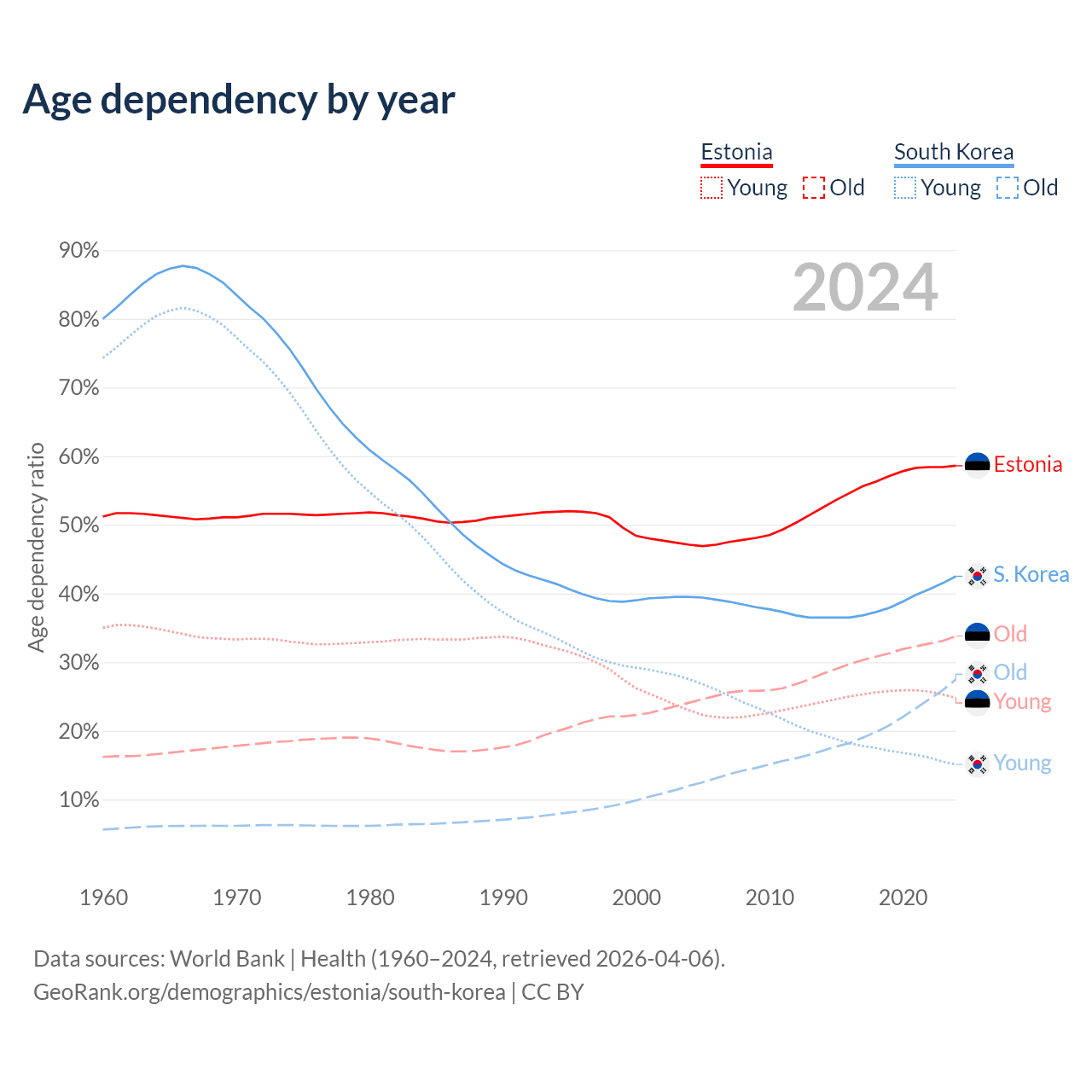 - Estonia is ranked 25/196 by median age (oldest to youngest) vs 10/196 for South Korea.