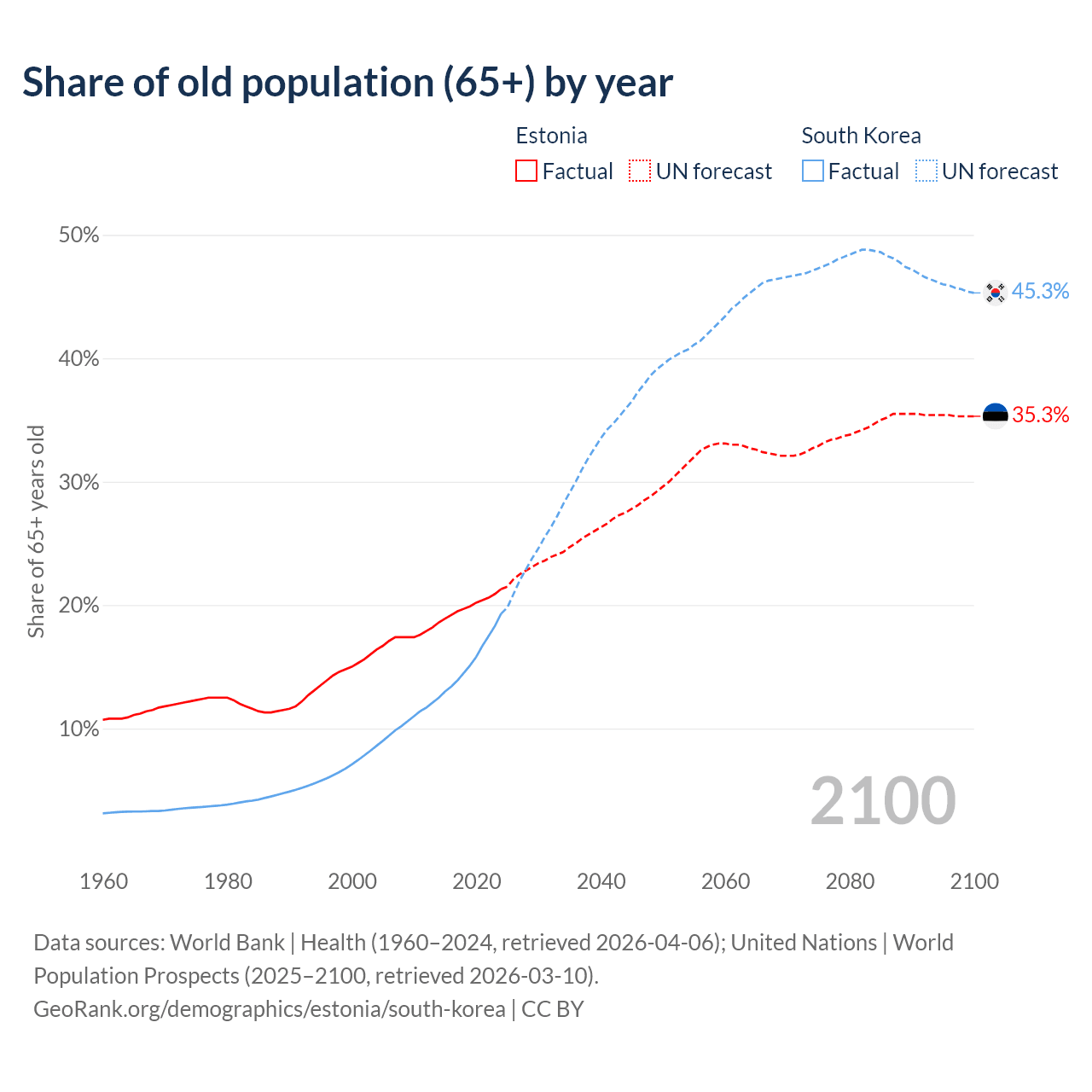 The share of older people aged 65 and over is 21.3% in Estonia and 19.3% in South Korea. Life expectancy in Estonia compared to South Korea .