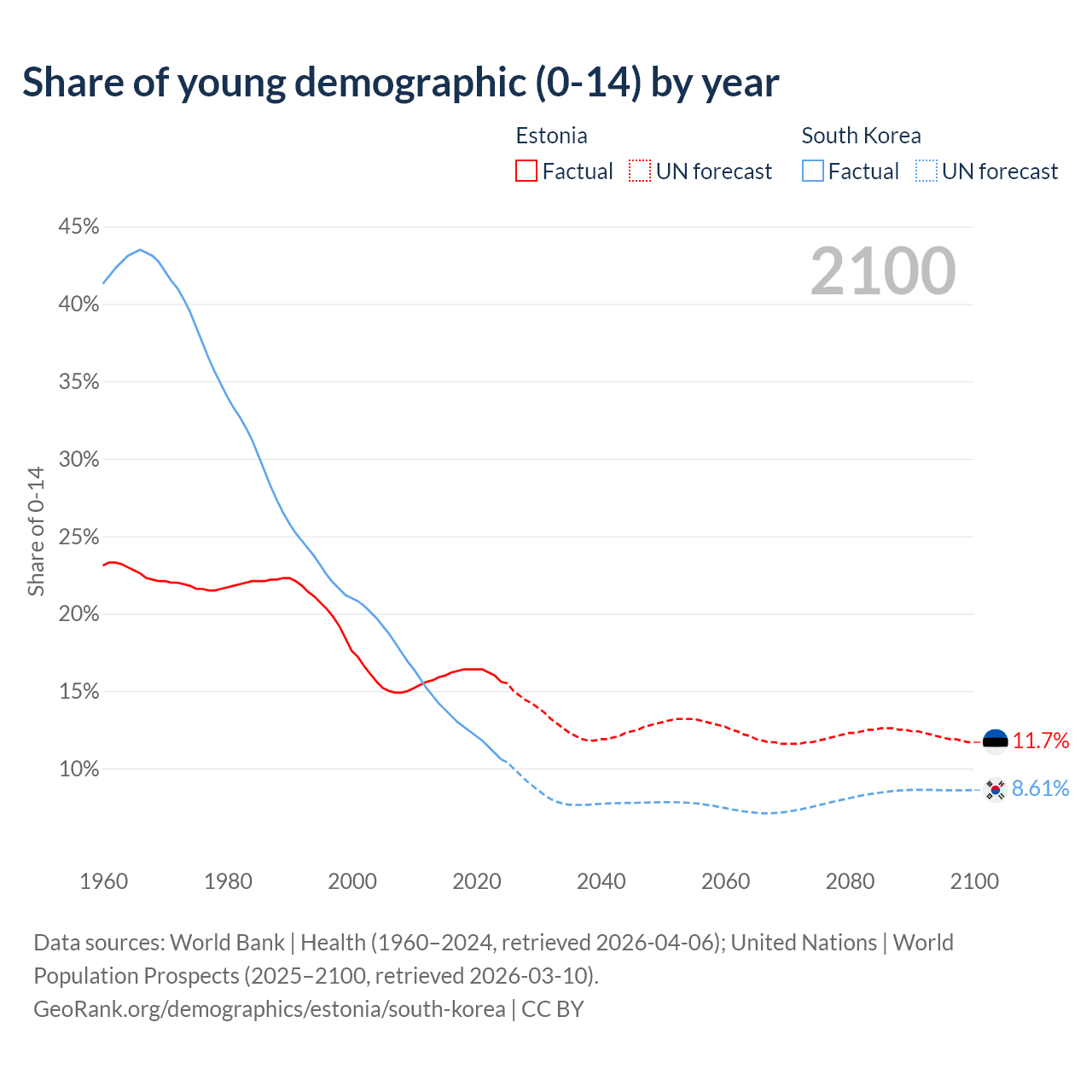 - The share of young demographic (0-15 years old) in Estonia is 15.6% vs 10.6% in South Korea.