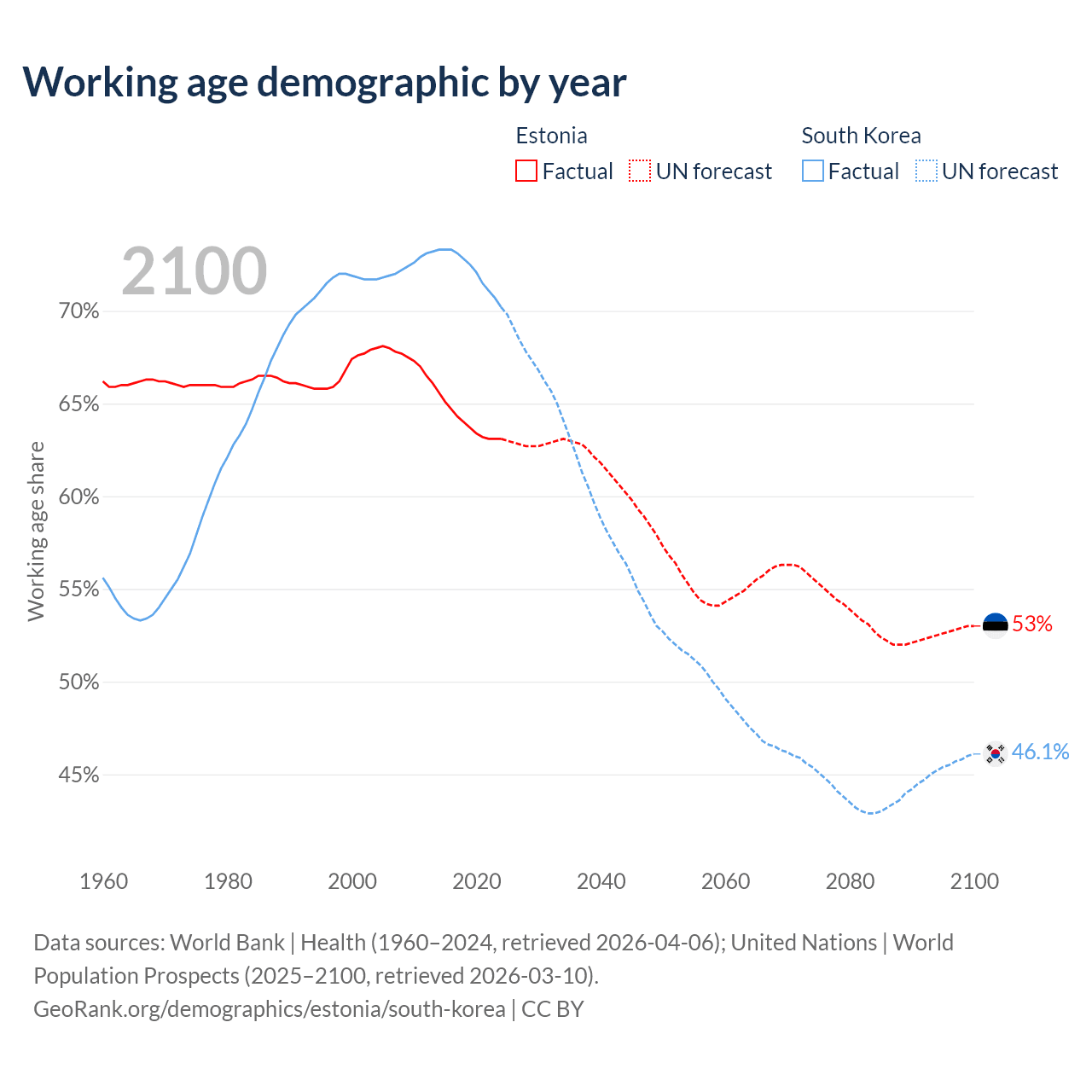 Median age Estonia vs South Korea, 1960-2100