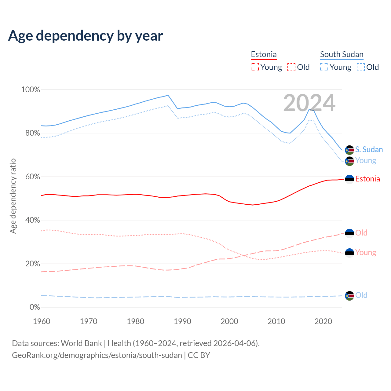 - The share of young demographic (0-15 years old) in Estonia is 15.6% vs 38.9% in South Sudan.