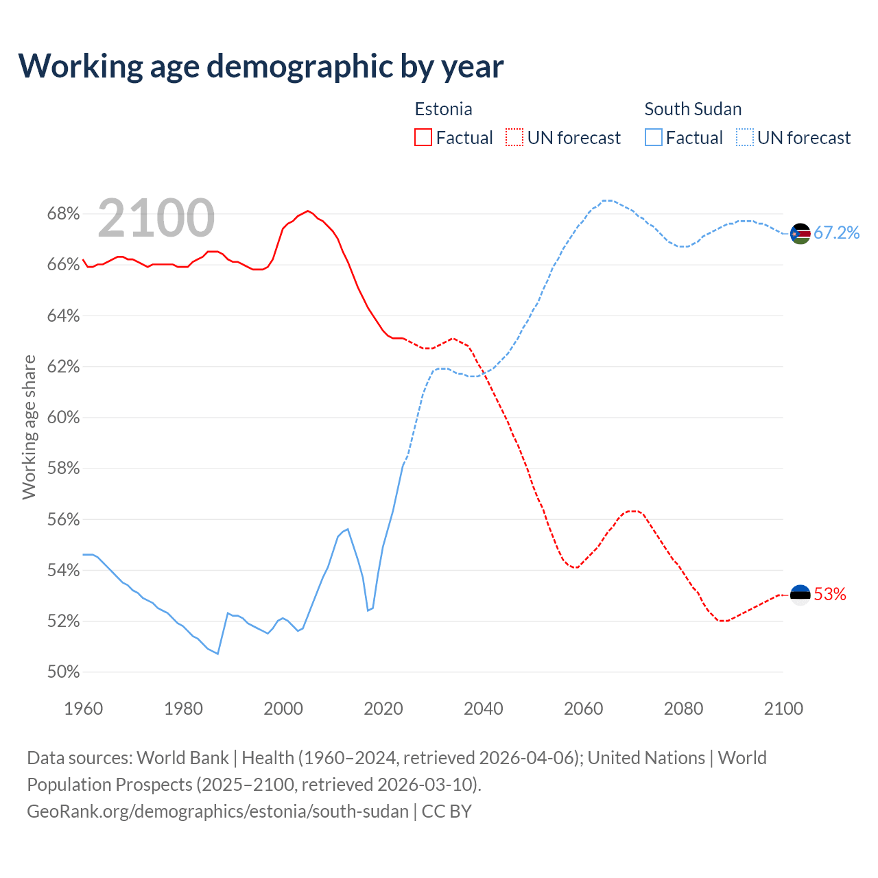 - Estonia has 845K working age adults (aged 15-64) vs 7.27M in South Sudan.